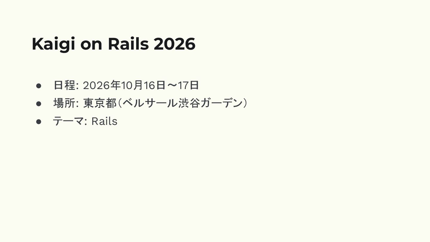 • 日程: 2026年10月16日〜17日 • 場所: 東京都(ベルサール渋谷ガーデン) • テーマ: Rails Kaigi
