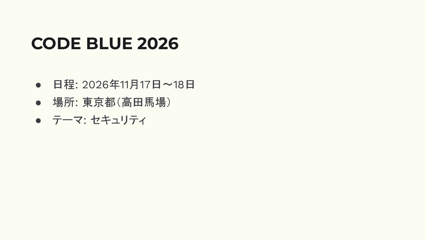 • 日程: 2026年11月17日〜18日 • 場所: 東京都(高田馬場) • テーマ: セキュリティ CODE