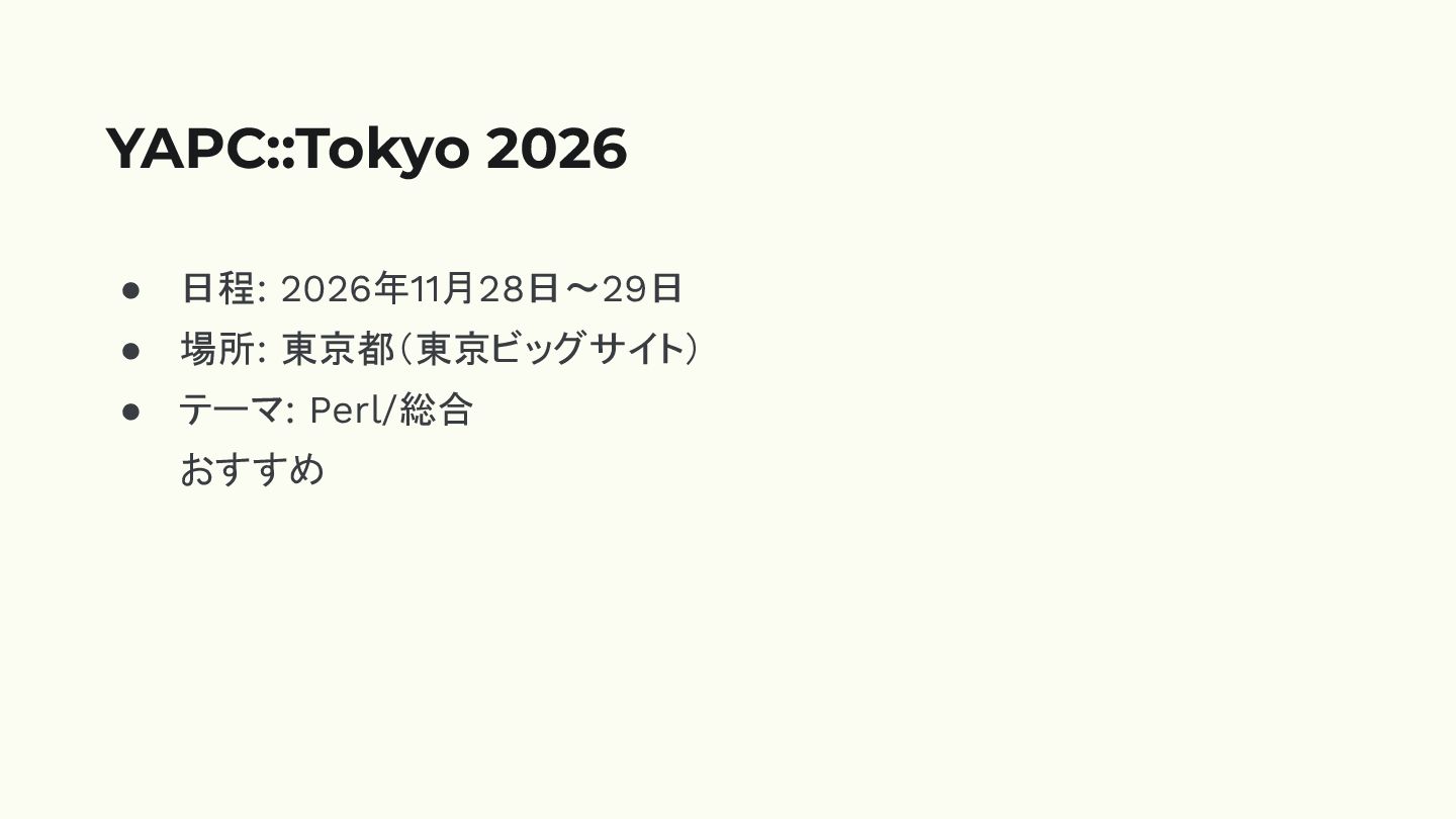 • 日程: 2026年11月28日〜29日 • 場所: 東京都(東京ビッグサイト) • テーマ: Perl/総合 おすすめ