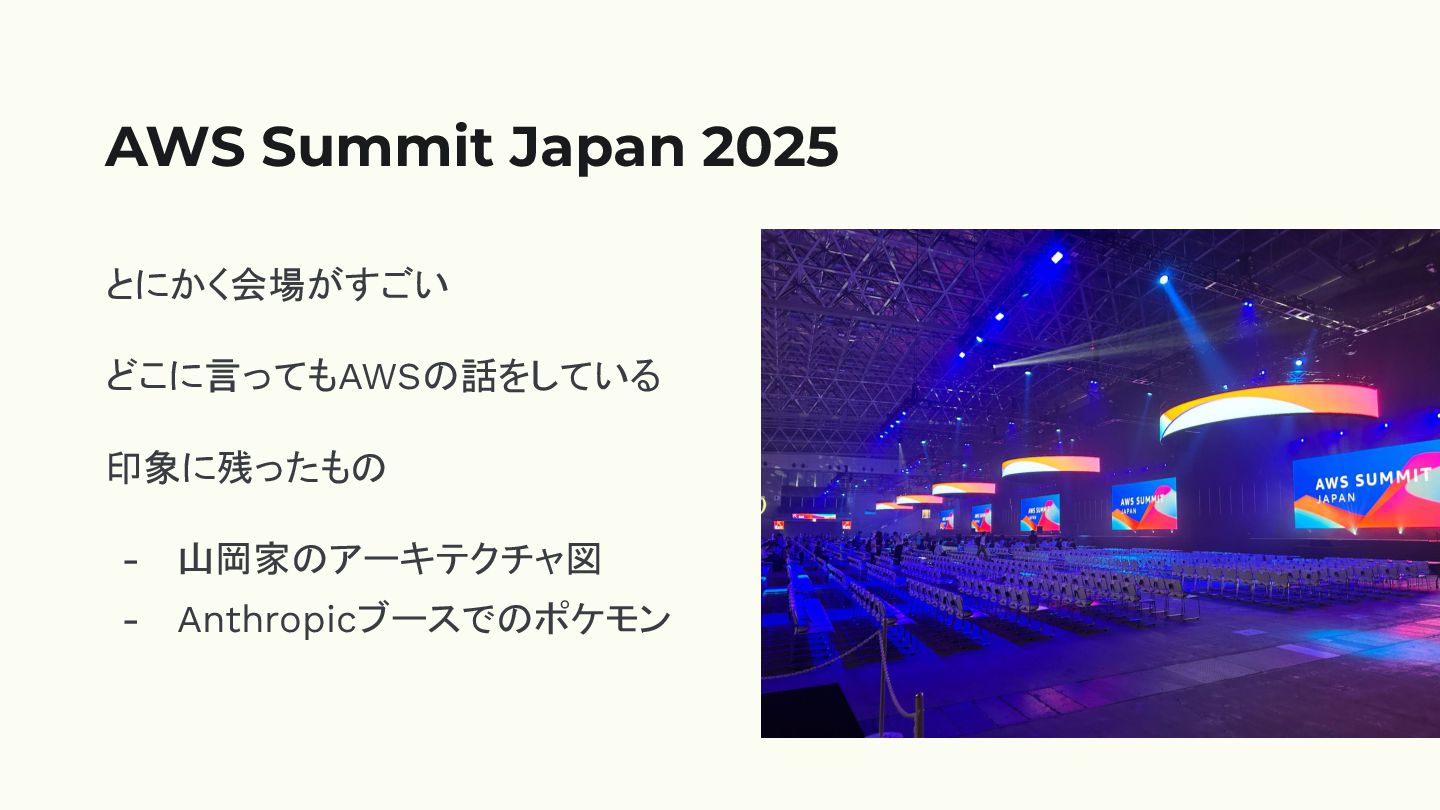 とにかく会場がすごい どこに言ってもAWSの話をしている 印象に残ったもの - 山岡家のアーキテクチャ図 - Anthropicブースでのポケモン AWS Summit Japan