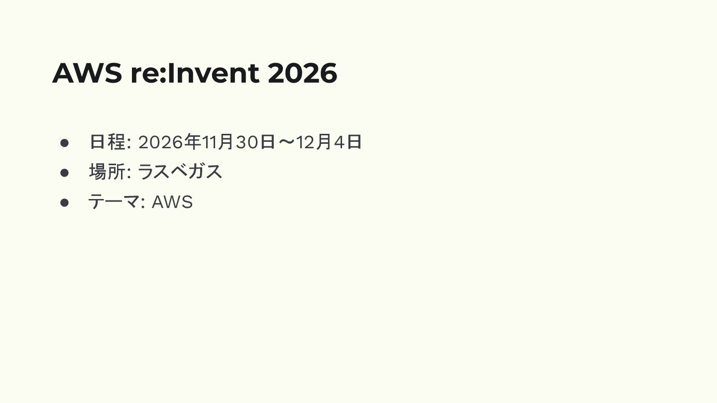 • 日程: 2026年11月30日〜12月4日 • 場所: ラスベガス • テーマ: AWS AWS