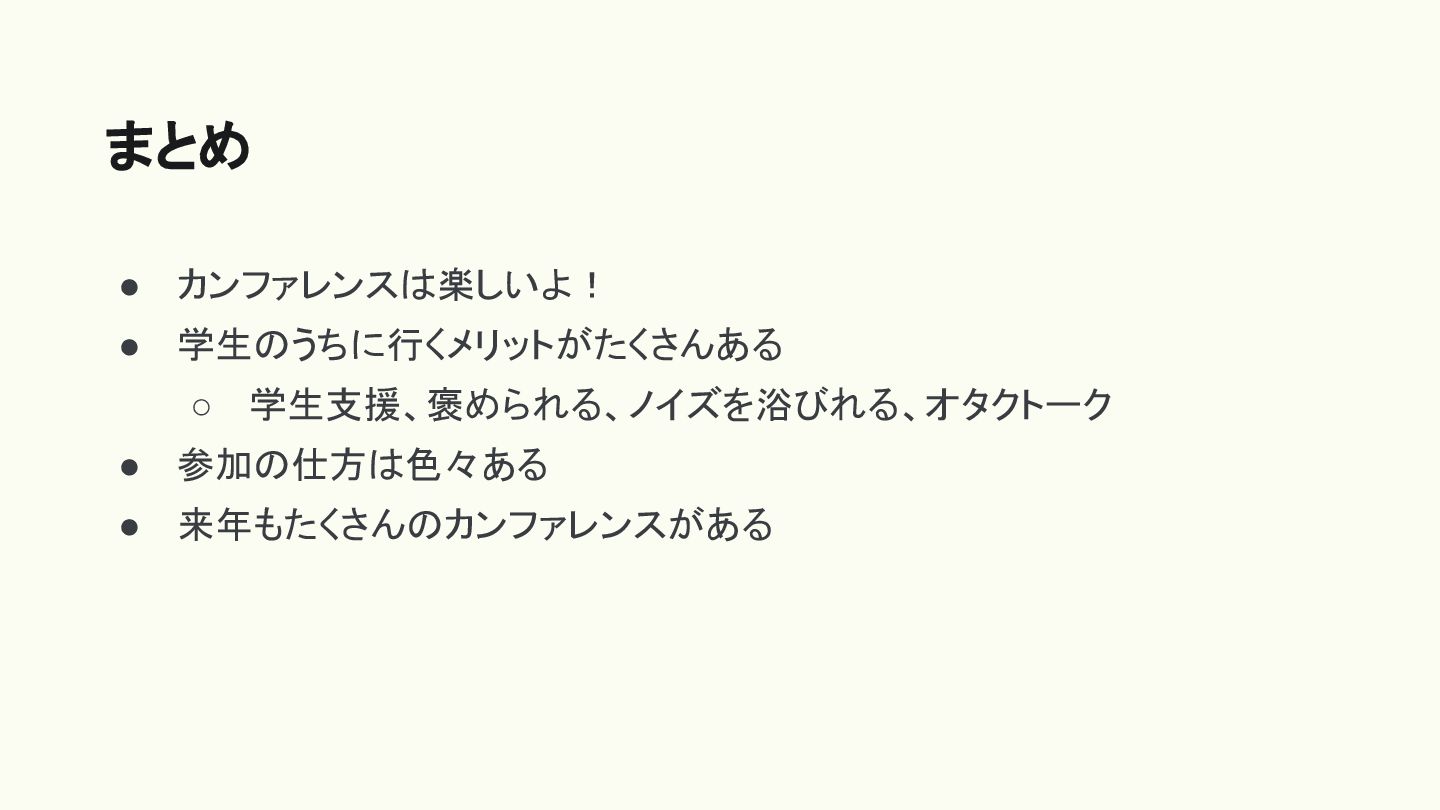• カンファレンスは楽しいよ! • 学生のうちに行くメリットがたくさんある ◦ 学生支援、褒められる、ノイズを浴びれる、オタクトーク • 参加の仕方は色々ある • 来年もたくさんのカンファレンスがある