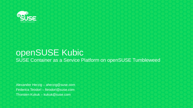 openSUSE Kubic is the SUSE Container as a Service Platform based on openSUSE Tumbleweed. In this talk, we want to present what this is, how this works, how people can get involved.