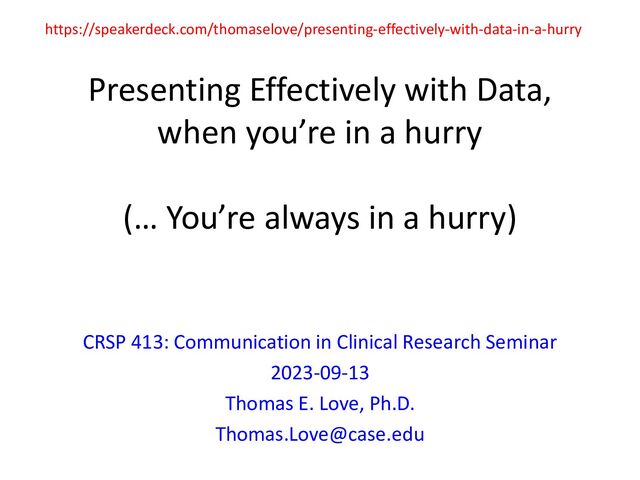 You’re always in a hurry) CRSP 413: Communication in Clinical Research Seminar 2023-09-13 Thomas E. Love, Ph.D. [email protected] https://speakerdeck.com/thomaselove/presenting-effectively-with-data-in-a-hurry