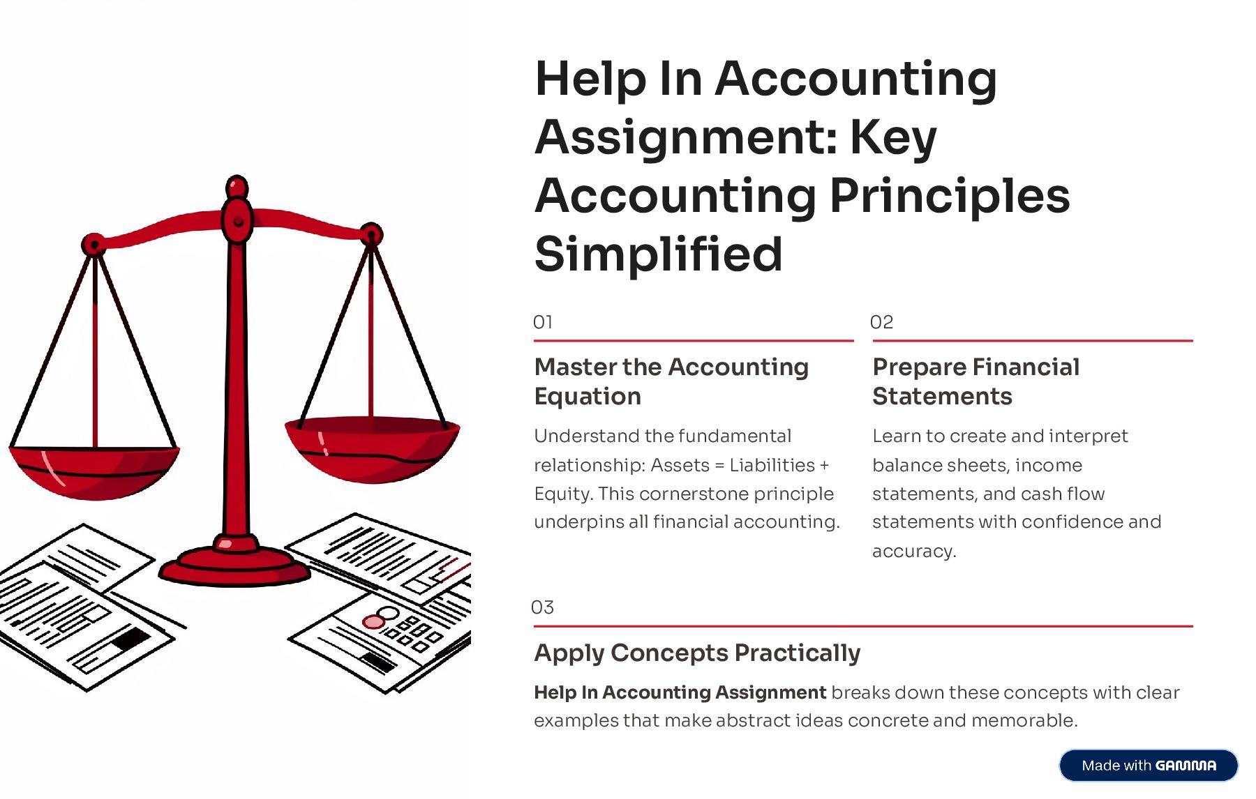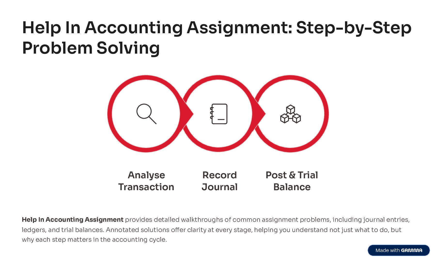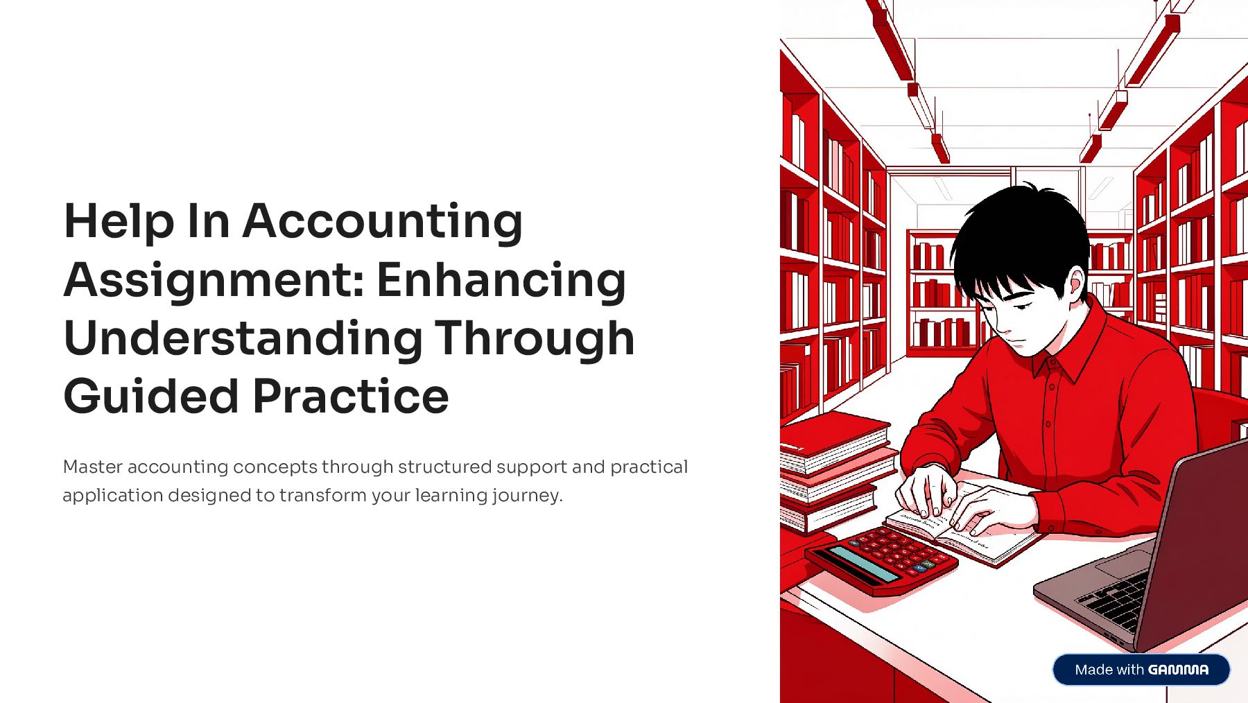 Help In Accounting Assignment: Enhancing Understanding Through Guided Practice focuses on supporting students in mastering accounting concepts through clear explanations, structured methods, and practical examples. This presentation highlights how step-by-step guidance can simplify complex accounting problems, improve accuracy, and build confidence in preparing assignments. By combining theoretical knowledge with real-world application, it demonstrates effective strategies for understanding financial statements, journal entries, ledgers, and other core accounting tasks. The aim is to make accounting assignments less challenging and more meaningful through guided learning and consistent practice.