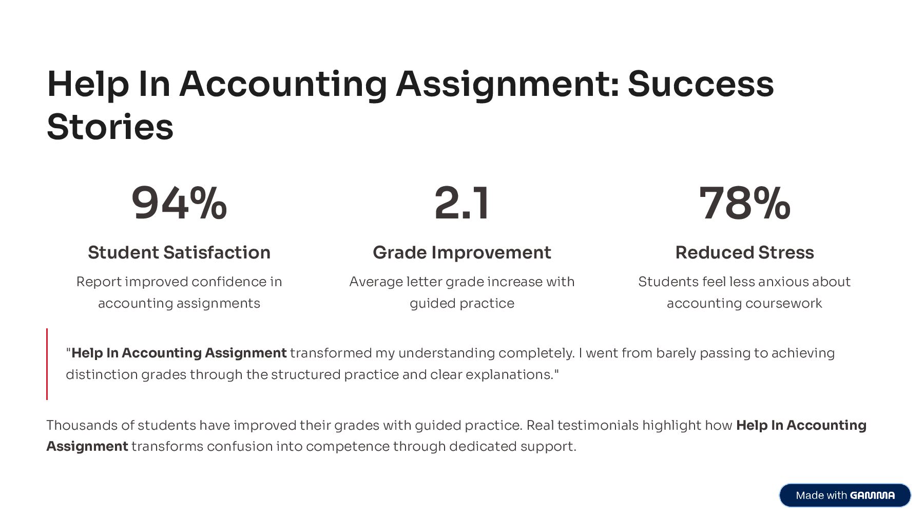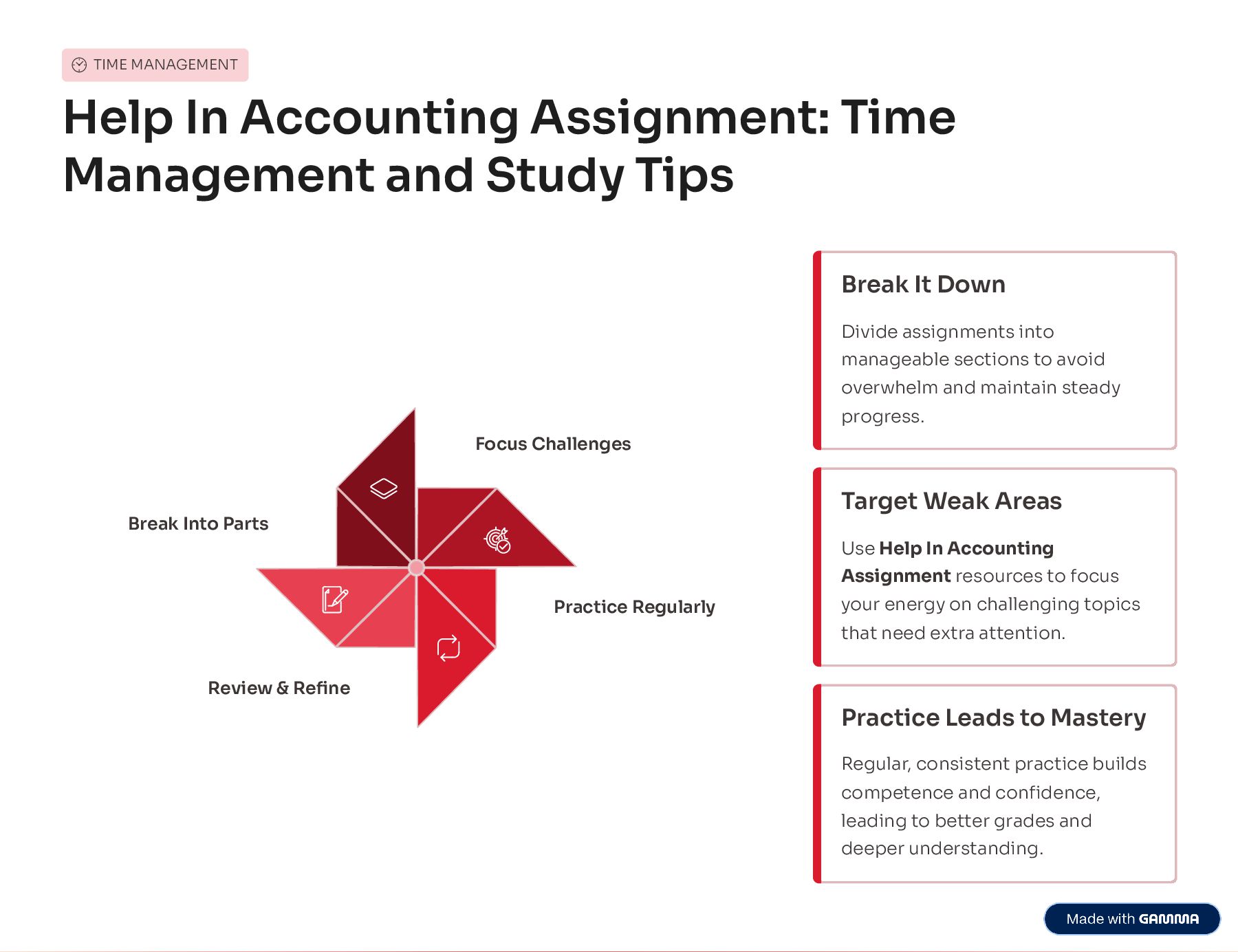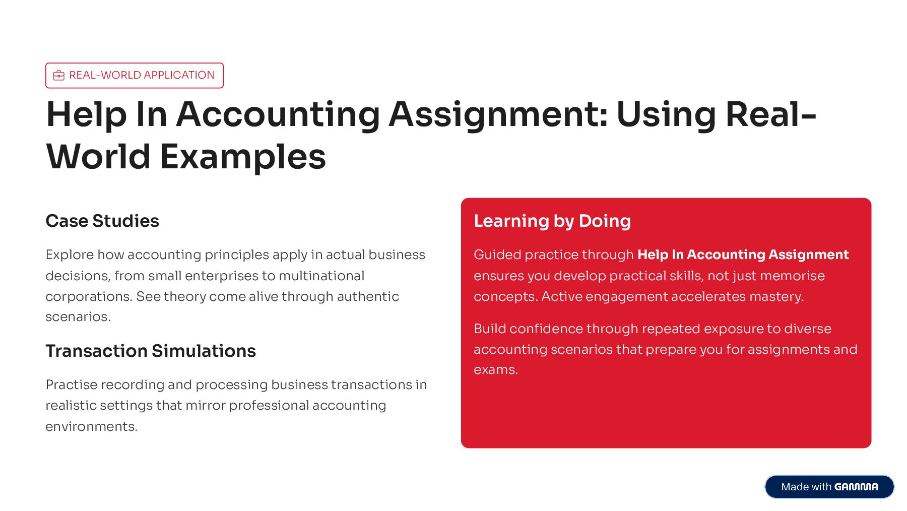 Help In Accounting Assignment: Enhancing Understanding Through Guided Practice focuses on supporting students in mastering accounting concepts through clear explanations, structured methods, and practical examples. This presentation highlights how step-by-step guidance can simplify complex accounting problems, improve accuracy, and build confidence in preparing assignments. By combining theoretical knowledge with real-world application, it demonstrates effective strategies for understanding financial statements, journal entries, ledgers, and other core accounting tasks. The aim is to make accounting assignments less challenging and more meaningful through guided learning and consistent practice.