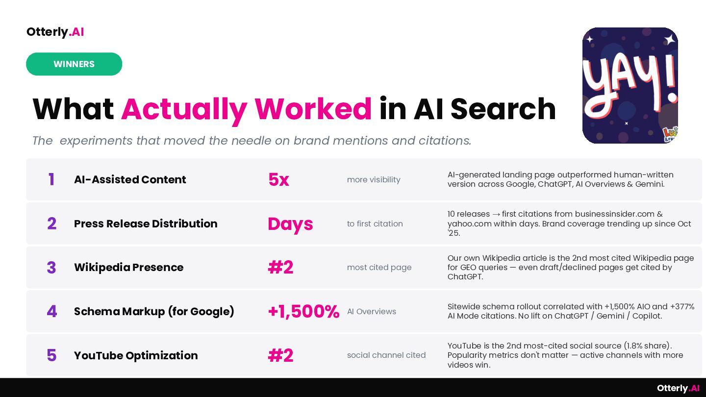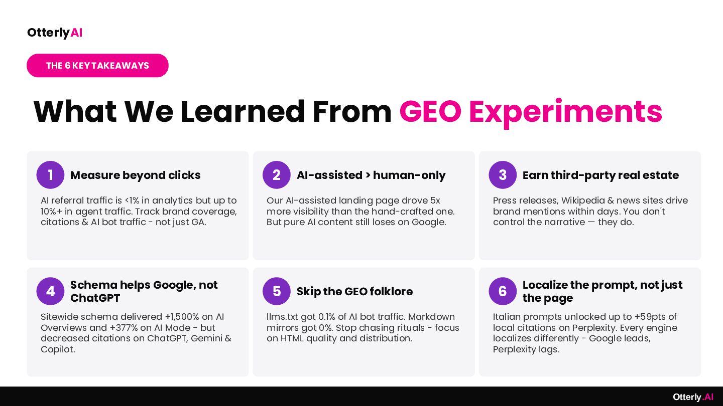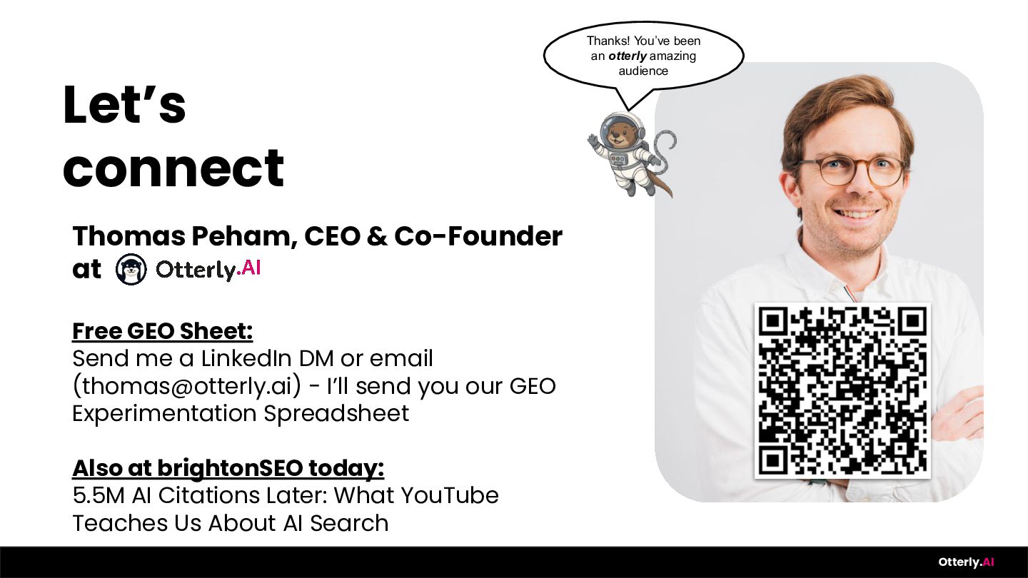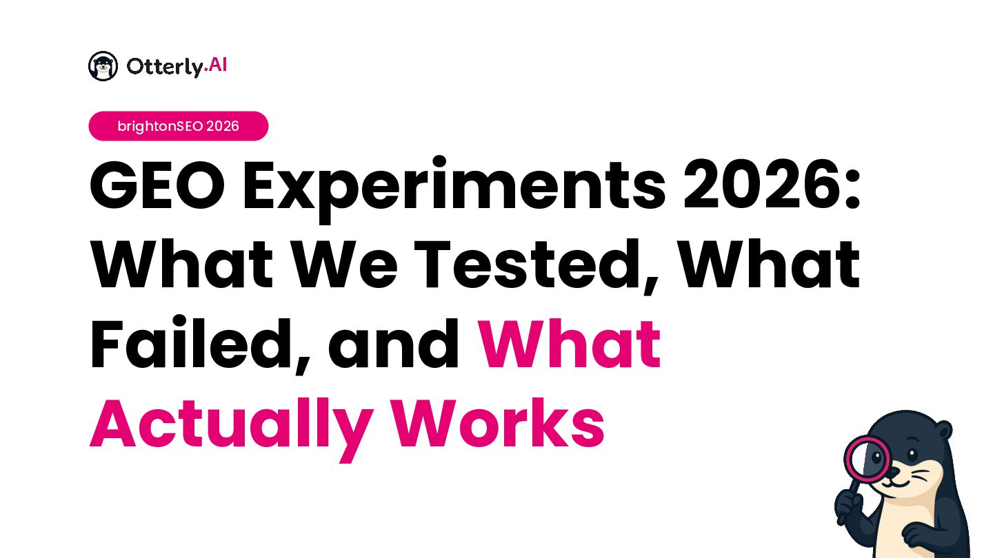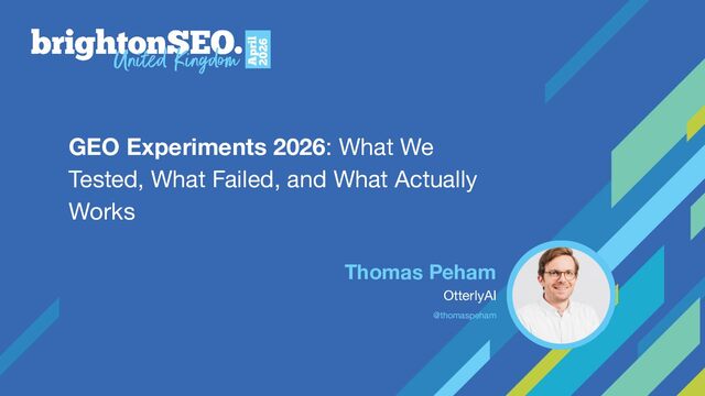 Everyone has opinions about Generative Engine Optimization. We have data. Over the past year, the OtterlyAI team ran dozens of controlled experiments - testing llms.txt, Schema Markup, AI-generated vs. human-written content, YouTube citation patterns, earned media outreach, and much more - tracking real outcomes across the largest AI Search platforms. Some results confirmed our hunches. Others completely surprised us. In this session, Thomas Peham walks through what worked, what flopped (looking at you, llms.txt), and the one experiment that got otterly.ai cited on ChatGPT within 24 hours. Expect raw data, honest failures, and a repeatable experimentation methodology you can take back to your team on Monday.