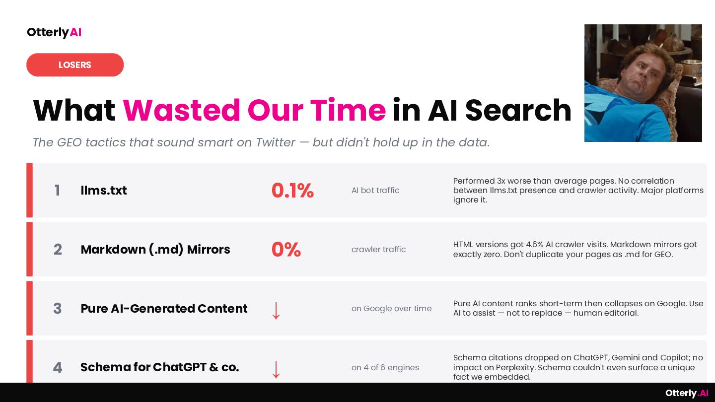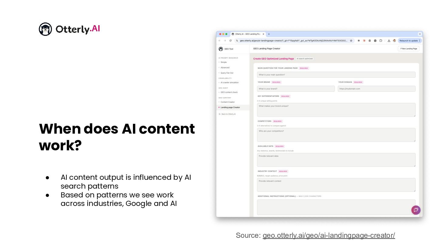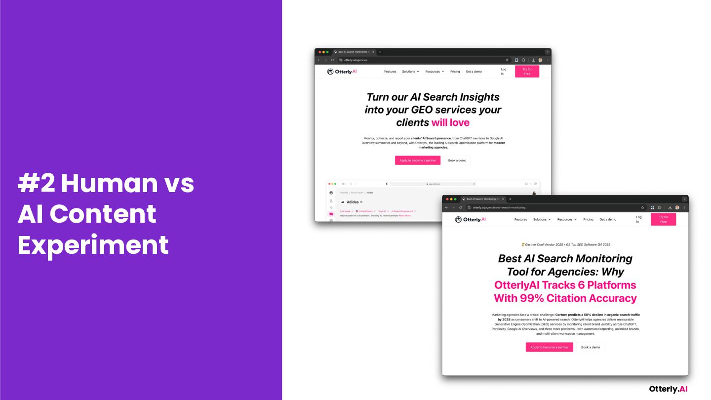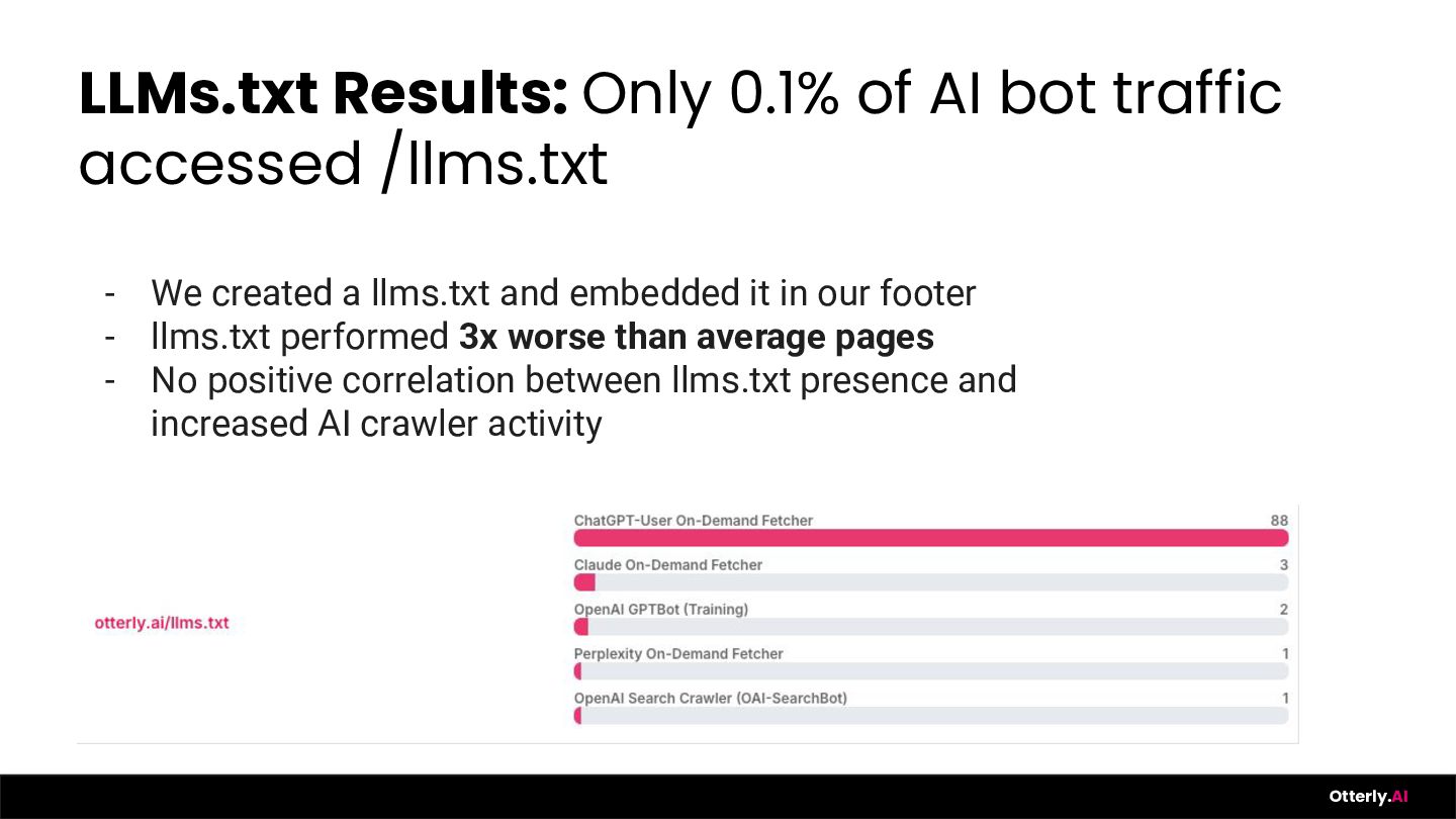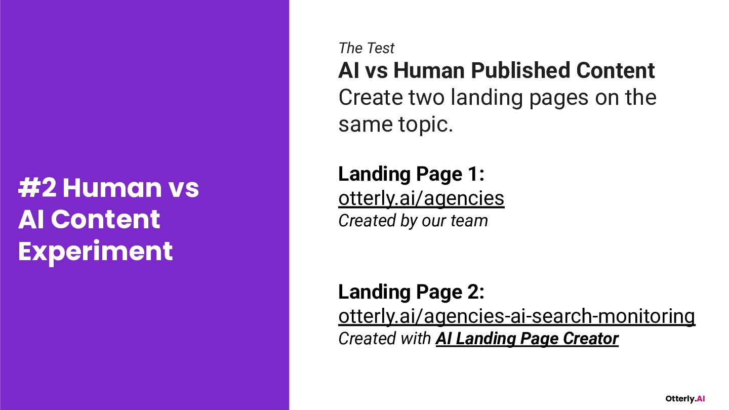 Everyone has opinions about Generative Engine Optimization. We have data. Over the past year, the OtterlyAI team ran dozens of controlled experiments - testing llms.txt, Schema Markup, AI-generated vs. human-written content, YouTube citation patterns, earned media outreach, and much more - tracking real outcomes across the largest AI Search platforms. Some results confirmed our hunches. Others completely surprised us. In this session, Thomas Peham walks through what worked, what flopped (looking at you, llms.txt), and the one experiment that got otterly.ai cited on ChatGPT within 24 hours. Expect raw data, honest failures, and a repeatable experimentation methodology you can take back to your team on Monday.