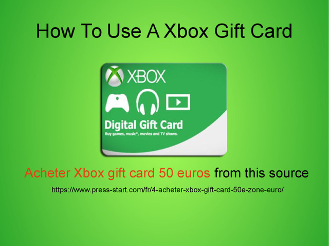 A Xbox Gift card is used to buy a Xbox Live membership. There are couple of ways to use xbox gift card as an account. this presentation describes about how to use a xbox gift card. Acheter Xbox gift card 50 euros for using gift card as an account.
