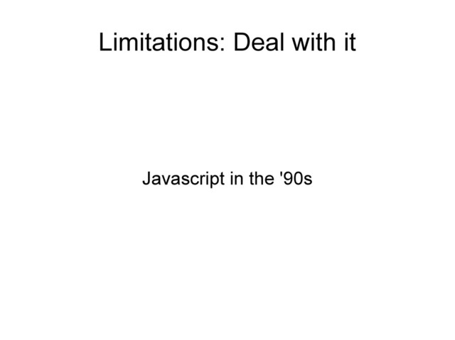 A technical and hands-on look at Javascript development in the days of Netscape 2 and IE 3, the restrictions and lack of features and how to deal with technical limitations in your development.