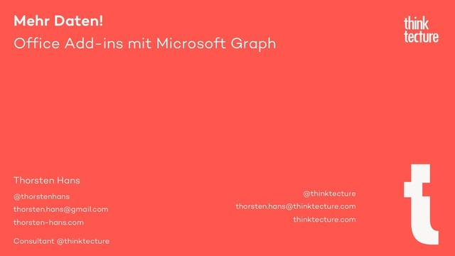 Mit Office Add-ins können Sie sämtliche Produkte der Office Suite unter Verwendung moderner Webtechnologien erweitern. Ein Add-in wird immer im Kontext eines Elements – z. B. einer E-Mail in Outlook oder einer Tabellenkalkulation in Excel – ausgeführt, doch in der Praxis benötigen Sie oftmals mehr Daten. Mit dem Microsoft Graph API können Sie direkt aus Ihrem Office Add-in heraus auf Daten in Microsoft 365 zugreifen und so noch komplexere Workflows abbilden. Sie möchten relevante Dokumente für den aktuellen Benutzer finden? Aus Word heraus einen neuen Termin im Kalender des Benutzers anlegen? Oder aus einem Excel Add-in eine E-Mail im Namen des Benutzers versenden? Thorsten Hans zeigt in diesem Vortrag, wie Sie Ihren Office Add-ins mit dem Microsoft Graph API Zugang zu mehr Daten verschaffen.