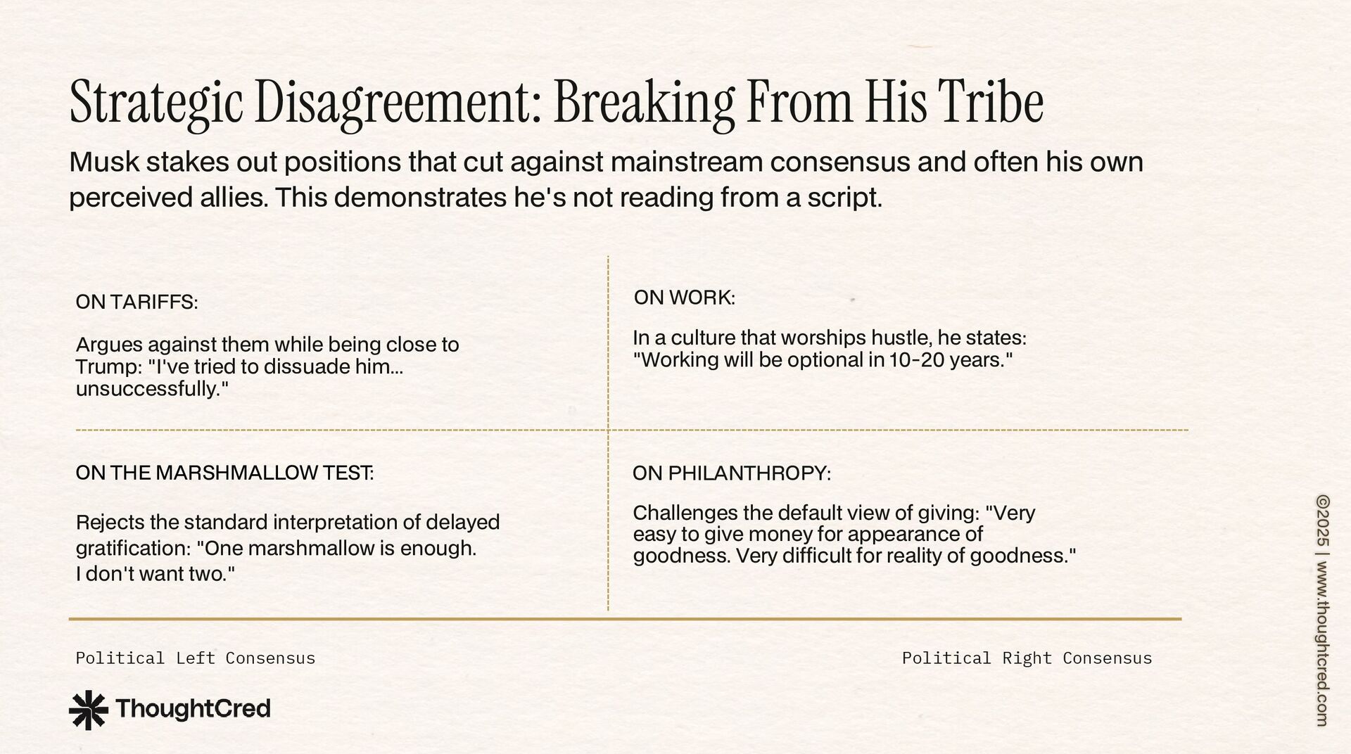 The Contrarian Positioning Map — Where he breaks from his tribe (and why it works)