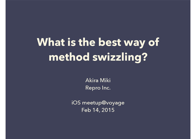 D And replace with `method_setImplementation` void _replacement_Method(id self, SEL _cmd) { NSLog(@"swizzed foo method”); ((void(*)(id,SEL))__original_Method_Imp)(self, _cmd); } static IMP __original_Method_Imp; @implementation InheritedBare + (void)swizzle { Method m = class_getInstanceMethod( [self class], @selector(foo)); __original_Method_Imp = method_setImplementation( m, (IMP)_replacement_Method ); } @end