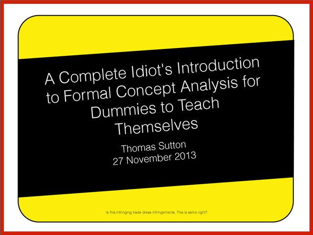 formalism which analyses the data in a context and attempts to extract the concepts embodied within that data. • Relating it to completely unrelated techniques for purely intuitive reasons, formal concept analysis might be thought of as the love child of decision tree learning and k-means clustering.