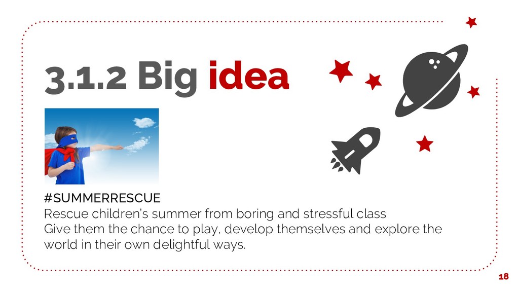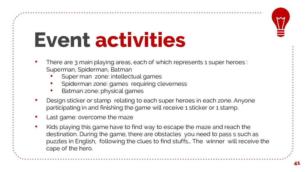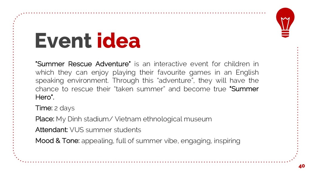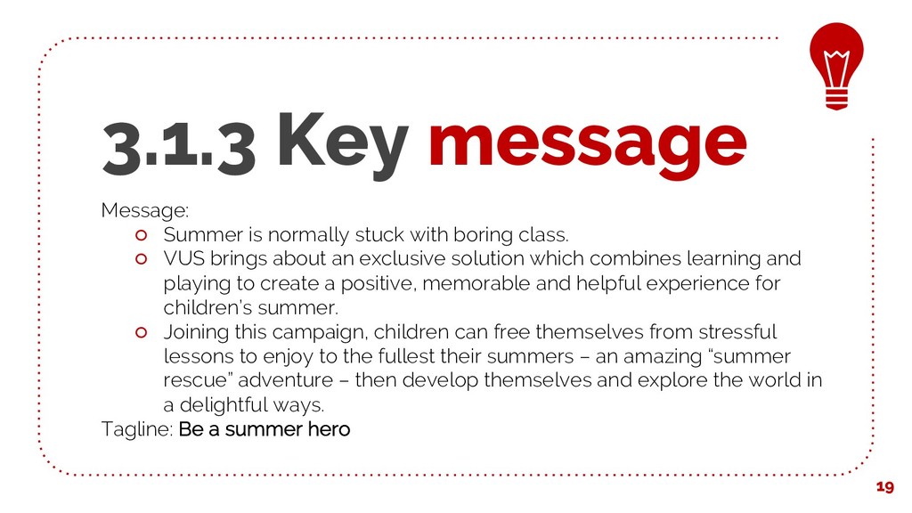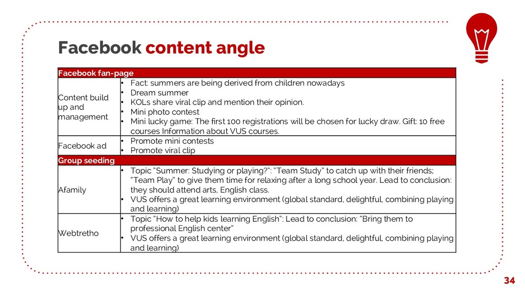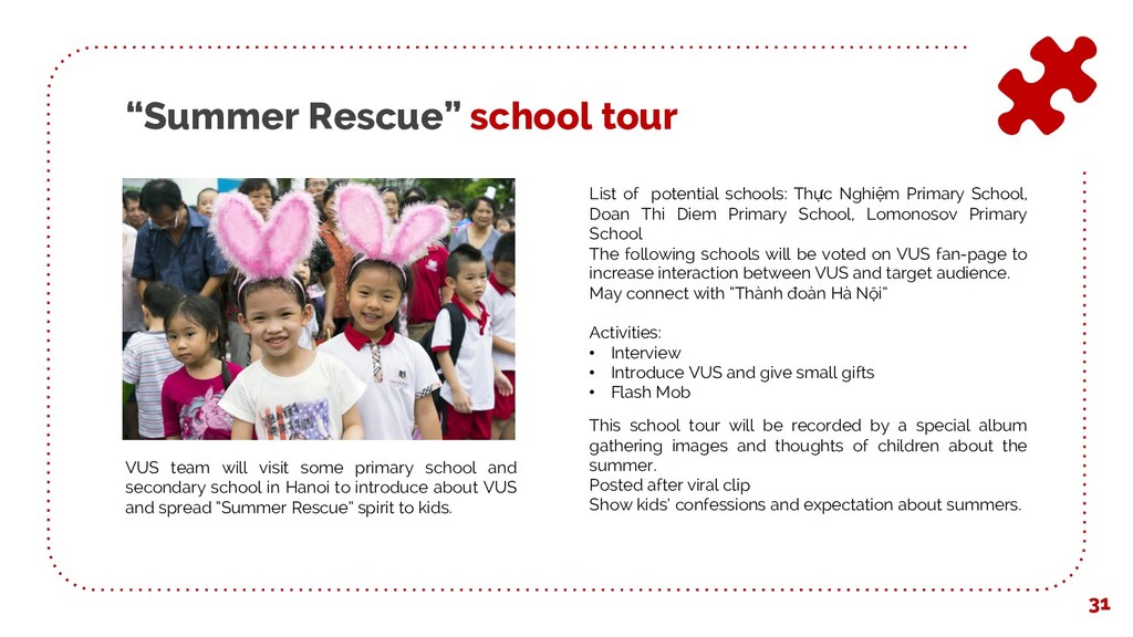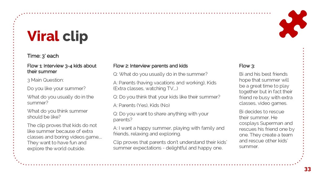 Question: Do you like your summer? What do you usually do in the summer? What do you think summer should be like? The clip proves that kids do not like summer because of extra classes and boring videos game,… They want to have fun and explore the world outside. Flow 2: Interview parents and kids Q: What do you usually do in the summer? A: Parents (having vacations and working), Kids (Extra classes, watching TV,…) Q: Do you think that your kids like their summer? A: Parents (Yes), Kids (No) Q: Do you want to share anything with your parents? A: I want a happy summer, playing with family and friends, relaxing and exploring. Clip proves that parents don’t understand their kids’ summer expectations - delightful and happy one. Flow 3: Bi and his best friends hope that summer will be a great time to play together but in fact their friend re busy with extra classes, video games. Bi decides to rescue their summer. He cosplays Superman and rescues his friend one by one. They create a team and rescue other kids’ summer. 33 Viral clip Time: 3’ each