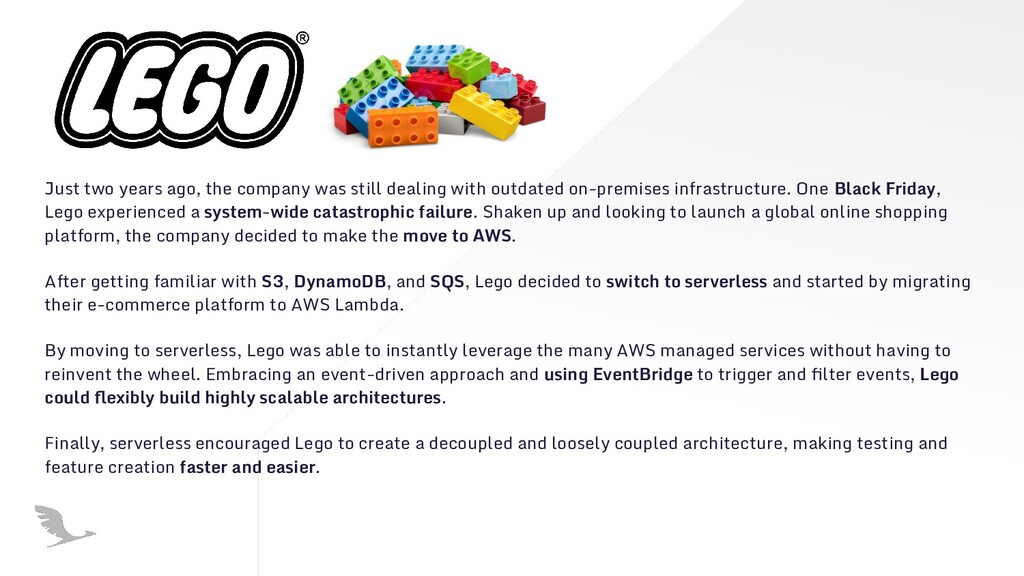 outdated on-premises infrastructure. One Black Friday, Lego experienced a system-wide catastrophic failure. Shaken up and looking to launch a global online shopping platform, the company decided to make the move to AWS. After getting familiar with S3, DynamoDB, and SQS, Lego decided to switch to serverless and started by migrating their e-commerce platform to AWS Lambda. By moving to serverless, Lego was able to instantly leverage the many AWS managed services without having to reinvent the wheel. Embracing an event-driven approach and using EventBridge to trigger and filter events, Lego could flexibly build highly scalable architectures. Finally, serverless encouraged Lego to create a decoupled and loosely coupled architecture, making testing and feature creation faster and easier.