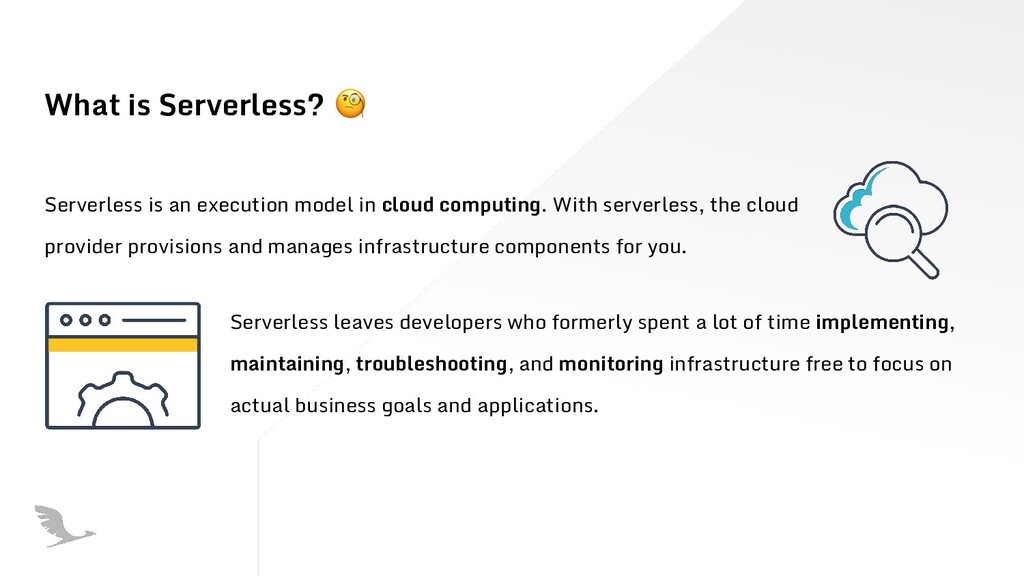 computing. With serverless, the cloud provider provisions and manages infrastructure components for you. Serverless leaves developers who formerly spent a lot of time implementing, maintaining, troubleshooting, and monitoring infrastructure free to focus on actual business goals and applications.
