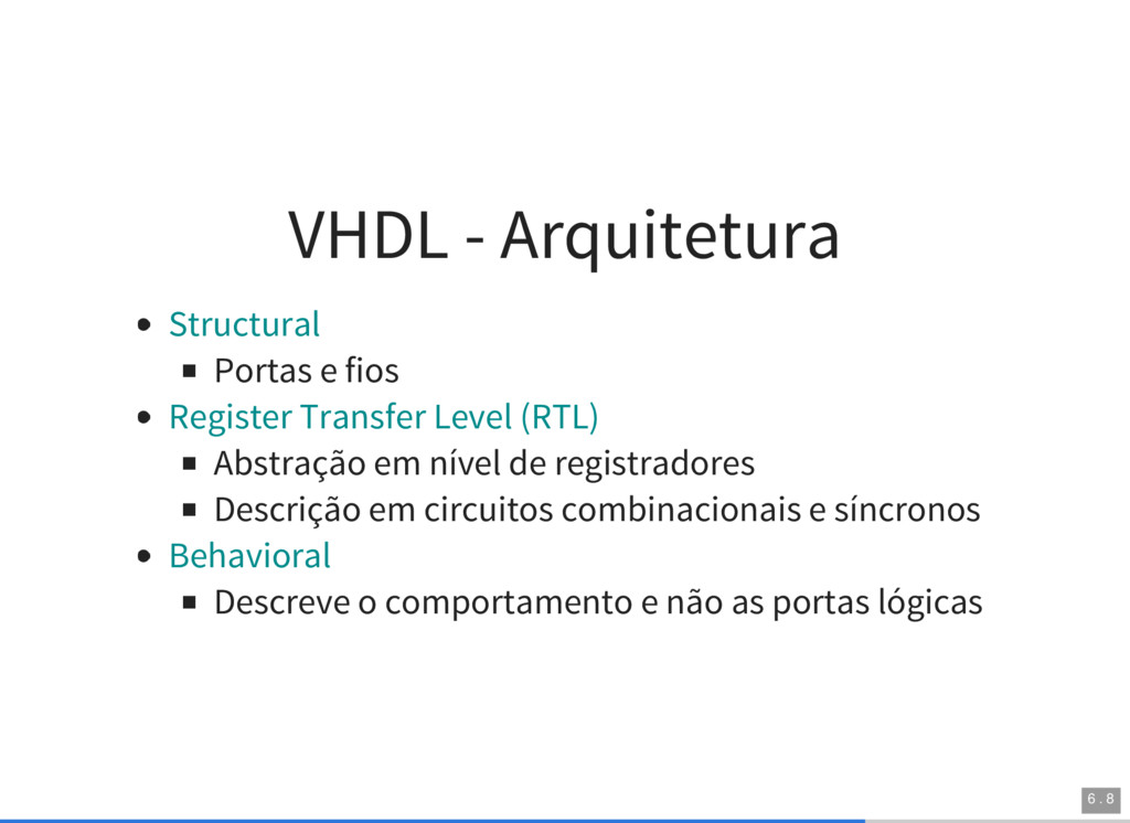 (RTL) Abstração em nível de registradores Descrição em circuitos combinacionais e síncronos Behavioral Descreve o comportamento e não as portas lógicas 6 . 8