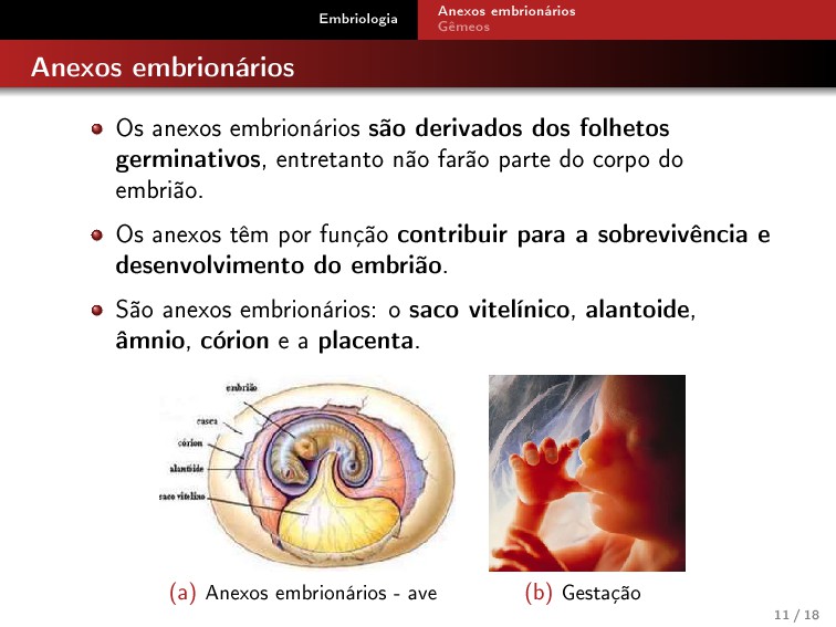 derivados dos folhetos germinativos, entretanto não farão parte do corpo do embrião. Os anexos têm por função contribuir para a sobrevivência e desenvolvimento do embrião. São anexos embrionários: o saco vitelínico, alantoide, âmnio, córion e a placenta. (a) Anexos embrionários - ave (b) Gestação 11 / 18