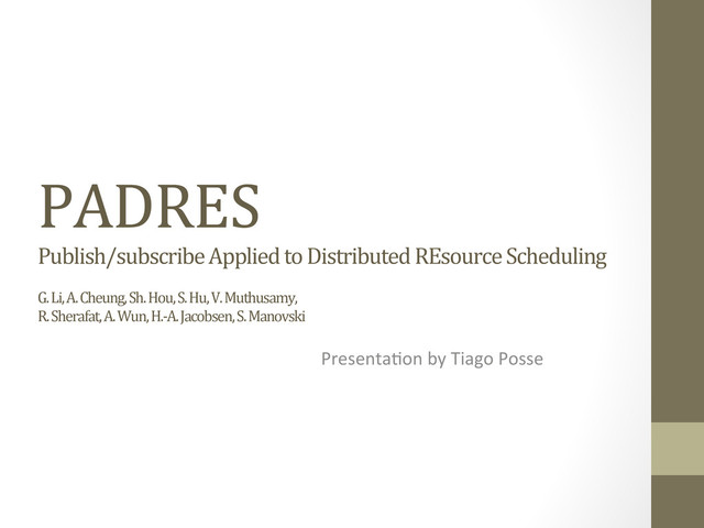This a presentation of PADRES (Publish/subscribe Applied to Distributed REsource Scheduling), a publish/subscribe middleware directed towards workflow management and business process execution.