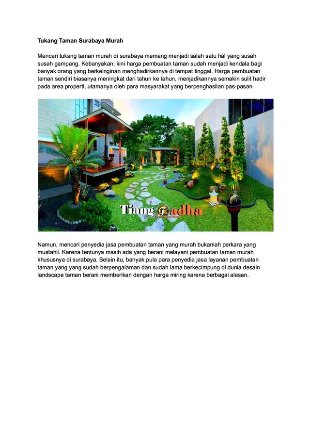 Tukang Taman Surabaya- Tianggadha Art ; Adalah jasa pembuatan taman (tukang taman) dan kolam hias profesional yang bertujuan menciptakan suasana yang asri dan nyaman dalam lingkungan tempat tinggal atau tempat kerja Anda. Layanan kami meliputi desain landscape taman, pembuatan taman, kolam ikan koi,