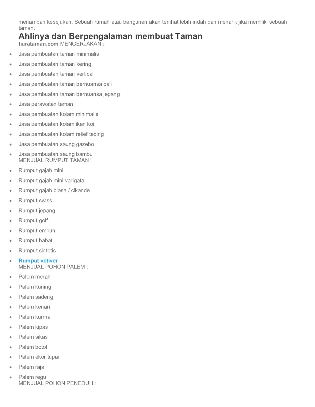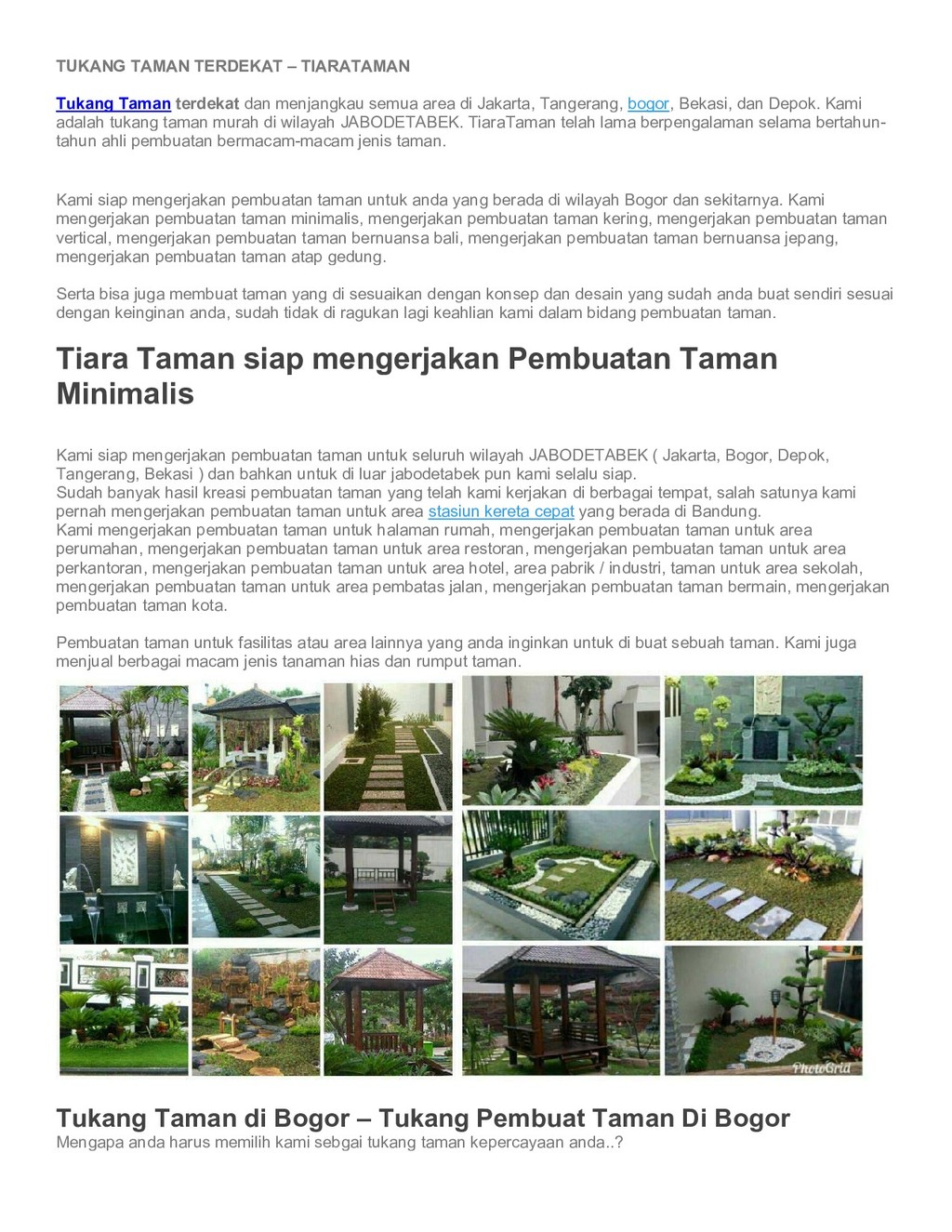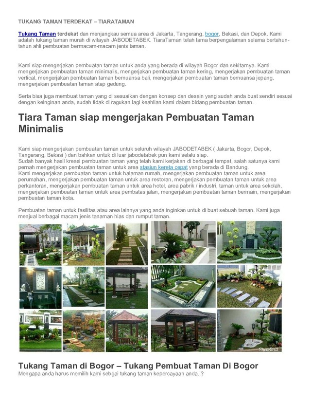 semua area di Jakarta, Tangerang, bogor, Bekasi, dan Depok. Kami adalah tukang taman murah di wilayah JABODETABEK. TiaraTaman telah lama berpengalaman selama bertahun- tahun ahli pembuatan bermacam-macam jenis taman. Kami siap mengerjakan pembuatan taman untuk anda yang berada di wilayah Bogor dan sekitarnya. Kami mengerjakan pembuatan taman minimalis, mengerjakan pembuatan taman kering, mengerjakan pembuatan taman vertical, mengerjakan pembuatan taman bernuansa bali, mengerjakan pembuatan taman bernuansa jepang, mengerjakan pembuatan taman atap gedung. Serta bisa juga membuat taman yang di sesuaikan dengan konsep dan desain yang sudah anda buat sendiri sesuai dengan keinginan anda, sudah tidak di ragukan lagi keahlian kami dalam bidang pembuatan taman. Tiara Taman siap mengerjakan Pembuatan Taman Minimalis Kami siap mengerjakan pembuatan taman untuk seluruh wilayah JABODETABEK ( Jakarta, Bogor, Depok, Tangerang, Bekasi ) dan bahkan untuk di luar jabodetabek pun kami selalu siap. Sudah banyak hasil kreasi pembuatan taman yang telah kami kerjakan di berbagai tempat, salah satunya kami pernah mengerjakan pembuatan taman untuk area stasiun kereta cepat yang berada di Bandung. Kami mengerjakan pembuatan taman untuk halaman rumah, mengerjakan pembuatan taman untuk area perumahan, mengerjakan pembuatan taman untuk area restoran, mengerjakan pembuatan taman untuk area perkantoran, mengerjakan pembuatan taman untuk area hotel, area pabrik / industri, taman untuk area sekolah, mengerjakan pembuatan taman untuk area pembatas jalan, mengerjakan pembuatan taman bermain, mengerjakan pembuatan taman kota. Pembuatan taman untuk fasilitas atau area lainnya yang anda inginkan untuk di buat sebuah taman. Kami juga menjual berbagai macam jenis tanaman hias dan rumput taman. Tukang Taman di Bogor – Tukang Pembuat Taman Di Bogor Mengapa anda harus memilih kami sebgai tukang taman kepercayaan anda..?