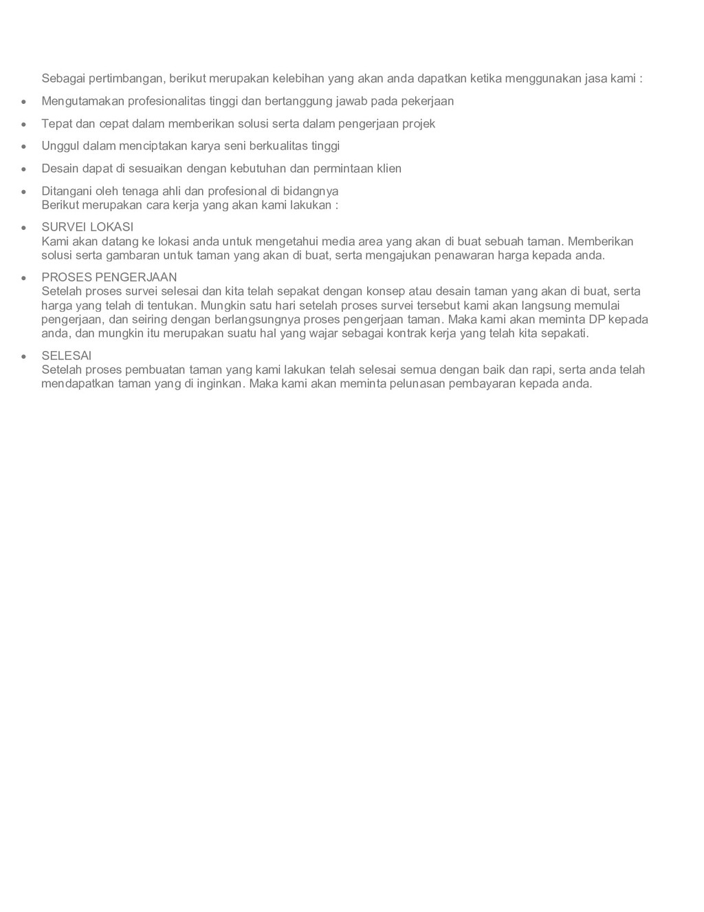 menggunakan jasa kami : Mengutamakan profesionalitas tinggi dan bertanggung jawab pada pekerjaan Tepat dan cepat dalam memberikan solusi serta dalam pengerjaan projek Unggul dalam menciptakan karya seni berkualitas tinggi Desain dapat di sesuaikan dengan kebutuhan dan permintaan klien Ditangani oleh tenaga ahli dan profesional di bidangnya Berikut merupakan cara kerja yang akan kami lakukan : SURVEI LOKASI Kami akan datang ke lokasi anda untuk mengetahui media area yang akan di buat sebuah taman. Memberikan solusi serta gambaran untuk taman yang akan di buat, serta mengajukan penawaran harga kepada anda. PROSES PENGERJAAN Setelah proses survei selesai dan kita telah sepakat dengan konsep atau desain taman yang akan di buat, serta harga yang telah di tentukan. Mungkin satu hari setelah proses survei tersebut kami akan langsung memulai pengerjaan, dan seiring dengan berlangsungnya proses pengerjaan taman. Maka kami akan meminta DP kepada anda, dan mungkin itu merupakan suatu hal yang wajar sebagai kontrak kerja yang telah kita sepakati. SELESAI Setelah proses pembuatan taman yang kami lakukan telah selesai semua dengan baik dan rapi, serta anda telah mendapatkan taman yang di inginkan. Maka kami akan meminta pelunasan pembayaran kepada anda.