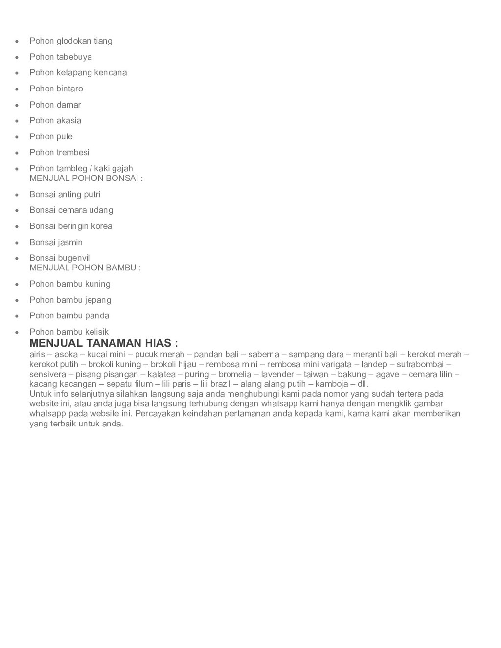 kencana Pohon bintaro Pohon damar Pohon akasia Pohon pule Pohon trembesi Pohon tambleg / kaki gajah MENJUAL POHON BONSAI : Bonsai anting putri Bonsai cemara udang Bonsai beringin korea Bonsai jasmin Bonsai bugenvil MENJUAL POHON BAMBU : Pohon bambu kuning Pohon bambu jepang Pohon bambu panda Pohon bambu kelisik MENJUAL TANAMAN HIAS : airis – asoka – kucai mini – pucuk merah – pandan bali – saberna – sampang dara – meranti bali – kerokot merah – kerokot putih – brokoli kuning – brokoli hijau – rembosa mini – rembosa mini varigata – landep – sutrabombai – sensivera – pisang pisangan – kalatea – puring – bromelia – lavender – taiwan – bakung – agave – cemara lilin – kacang kacangan – sepatu filum – lili paris – lili brazil – alang alang putih – kamboja – dll. Untuk info selanjutnya silahkan langsung saja anda menghubungi kami pada nomor yang sudah tertera pada website ini, atau anda juga bisa langsung terhubung dengan whatsapp kami hanya dengan mengklik gambar whatsapp pada website ini. Percayakan keindahan pertamanan anda kepada kami, karna kami akan memberikan yang terbaik untuk anda.