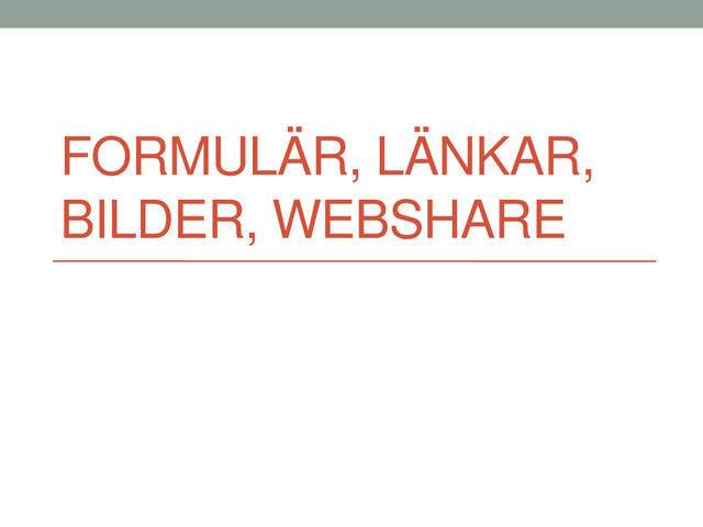 sida</title> </head> <body> <!-- Här kommer innehåll som visas för användaren ligga --> </body> </html> Element som ingår i ett HTML-dokument: - <html>, rotelementet - <head>, dokumenthuvud (info om dokumentet) - <title>, dokukmentets titel - <body>, dokumentets innehåll