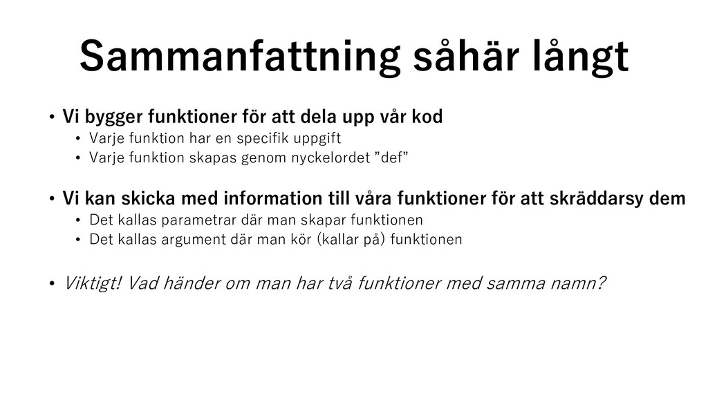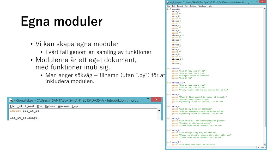 utav på inlämningsuppgiften är: • Random • Random-modulen har t.ex. följande funktioner • randint(a, b) Genererar ett slumptal mellan a & b (inkl, a & b) • sample(population, k) Väljer k antal värden från ett antal givna värden • random() Slumpar ett tal mellan 0,0 och 1,0
