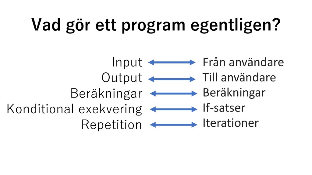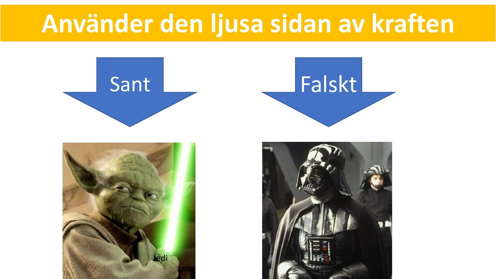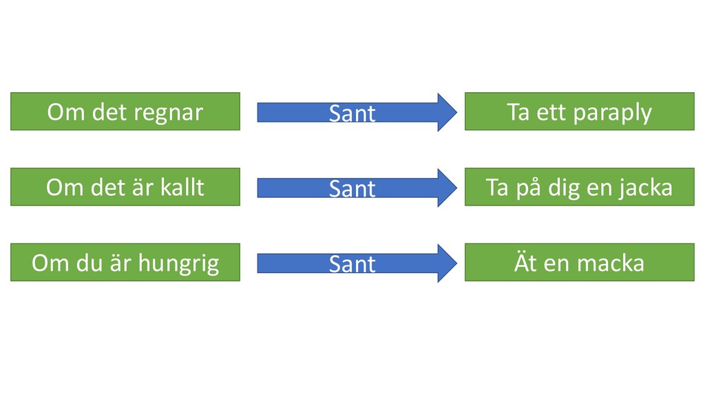 sant Uttryck Sant/Falskt True Sant False Falskt 5 > 2 Sant 2 > 5 Falskt 5 == 5 Sant 5 == 6 Falskt 5 != 6 Sant ”Anton” == ”anton” Falskt ”Anton” == ”Anton” Sant 5 == ”5” Falskt 0 == False Sant 20 == True Falskt Som falskt räknas, förtutom False: - None - Siffran 0 - Tomma strängar, eller datasamlingar: ””, [], {} De flesta andra värden räknas som sanna