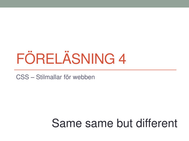 något • Nödvänligt att använda då datorn bara förstår 1 och 0. • Det betyder att allt i datorn (färger, figurer, knapptryckningar, beräkningar, musrörelser, bokstäver, siffror, typsnitt, bilder) representeras binärt. • T.ex. bokstaven A = 65 (dec) = 01000001 (bin) = 41 (hex) • I webbteknik kommer vi i kontakt med flera sådana bestämda regelsystem & standarder för hur saker och ting är representerade • CharacterEncoding(charset), hur tecken ska beskrivas, exempel ISO 8859, UTF 8, Unicode, …(äldre standard: ASCII) • Färgmodell, hur färger ska beskrivas, exempel RGB, CMY, CMYK