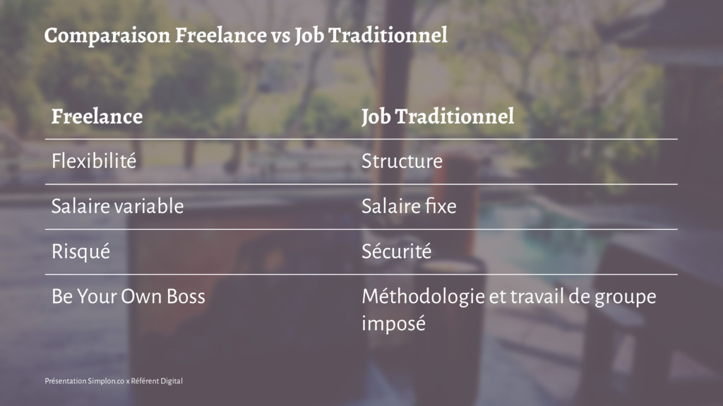Salaire variable Salaire fixe Risqué Sécurité Be Your Own Boss Méthodologie et travail de groupe imposé Présentation Simplon.co x Référent Digital