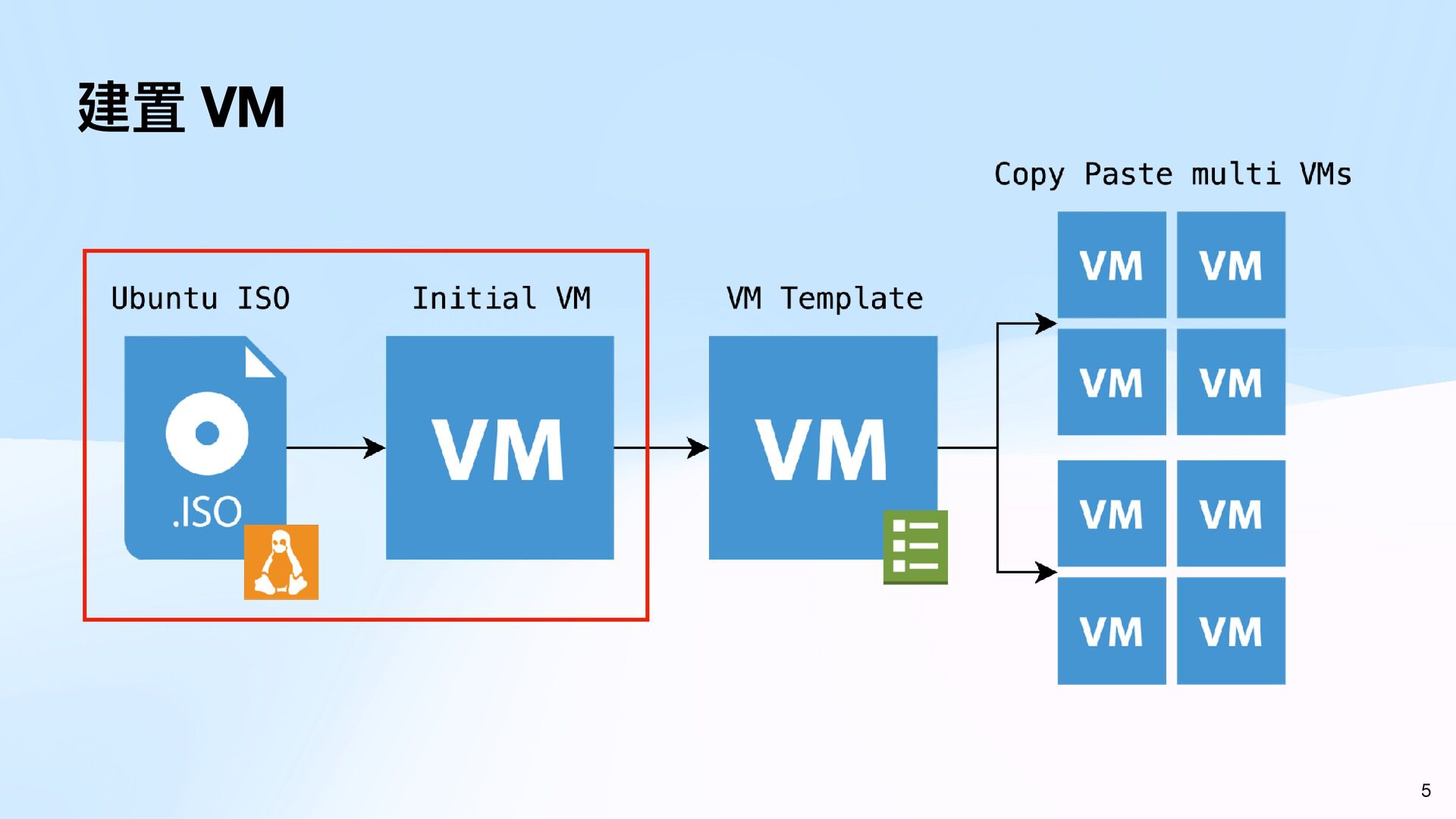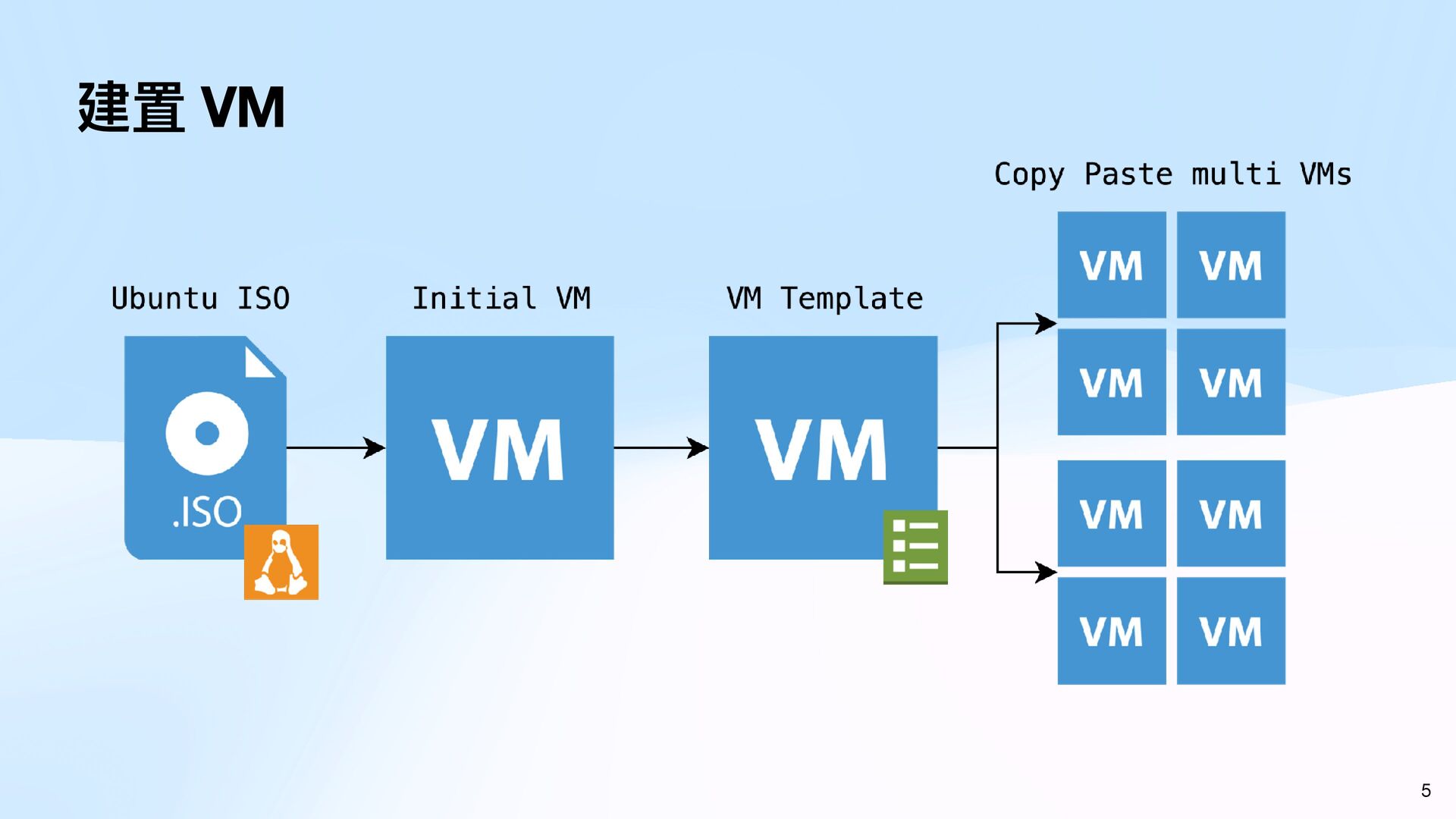 VM。 • 設定多台 VM 網路、套件 (CRI) • 用 Kubeadm 建立 cluster • (其他節點) 用 Kubeadm 加入 cluster • 安裝 CNI 等套件 4