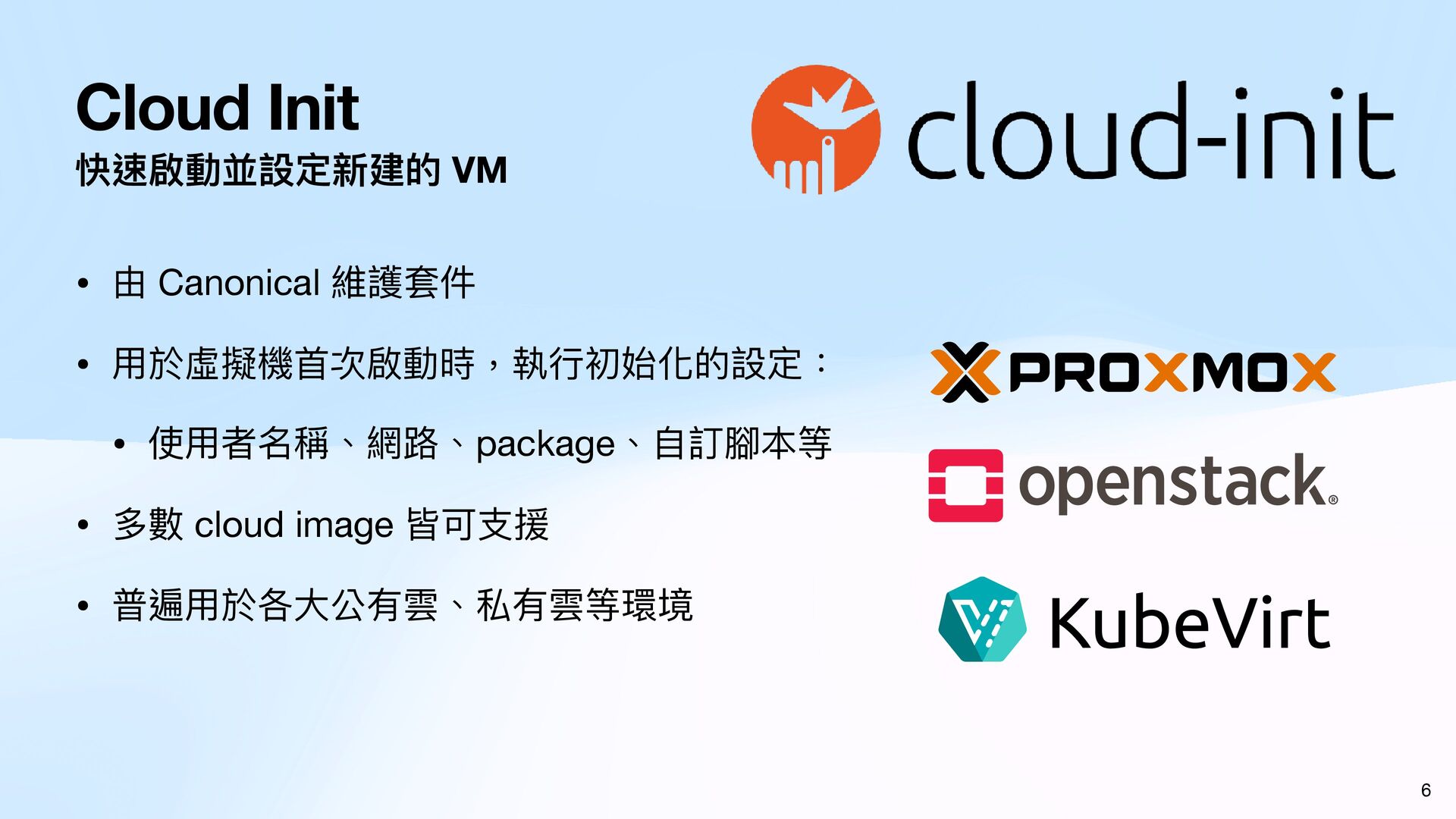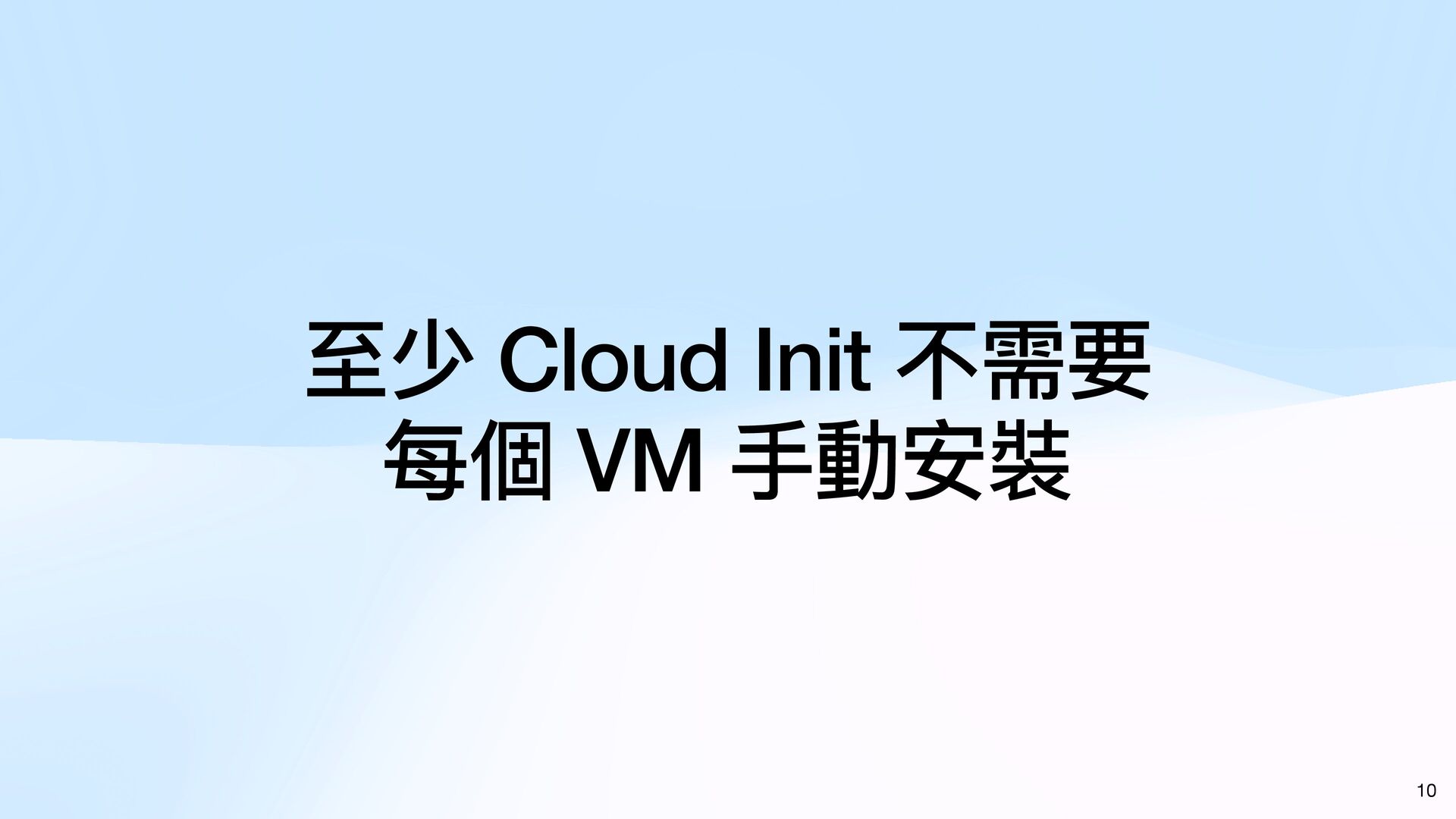 至 少 Cloud Init 不需要 每個 VM 手 動安裝 10