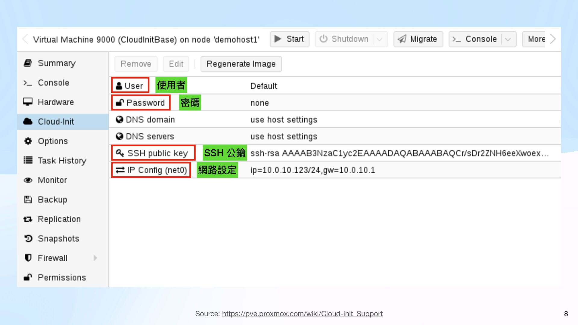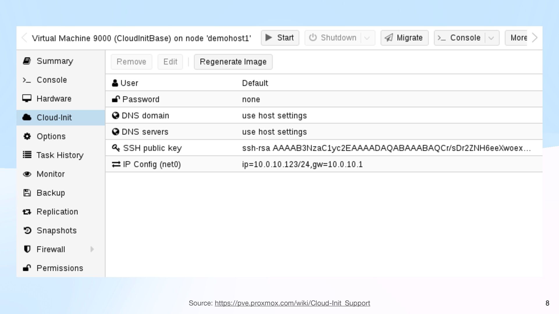 8 Source: https://pve.proxmox.com/wiki/Cloud-Init_Support
