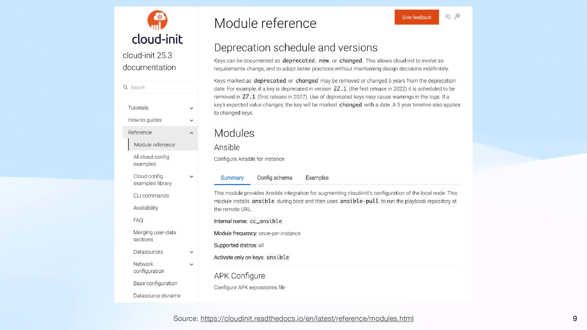 9 Source: https://cloudinit.readthedocs.io/en/latest/reference/modules.html
