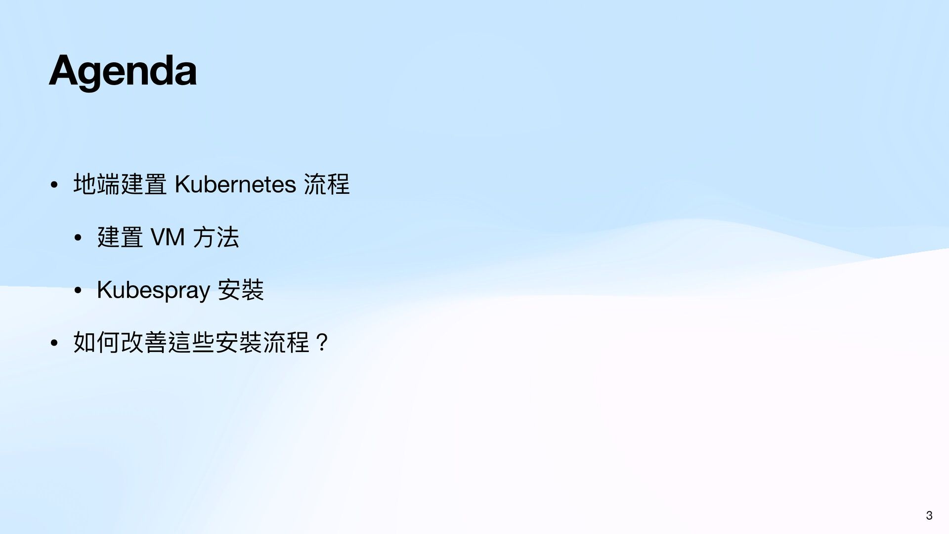 Agenda • 地端建置 Kubernetes 流程 • 建置 VM 方 法