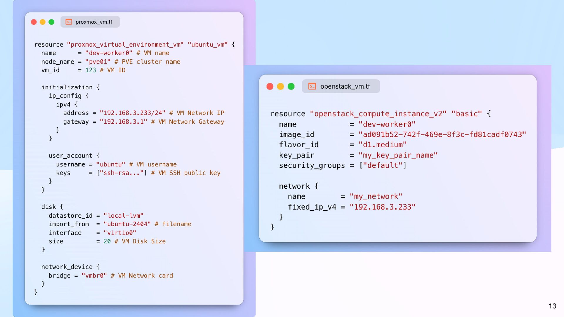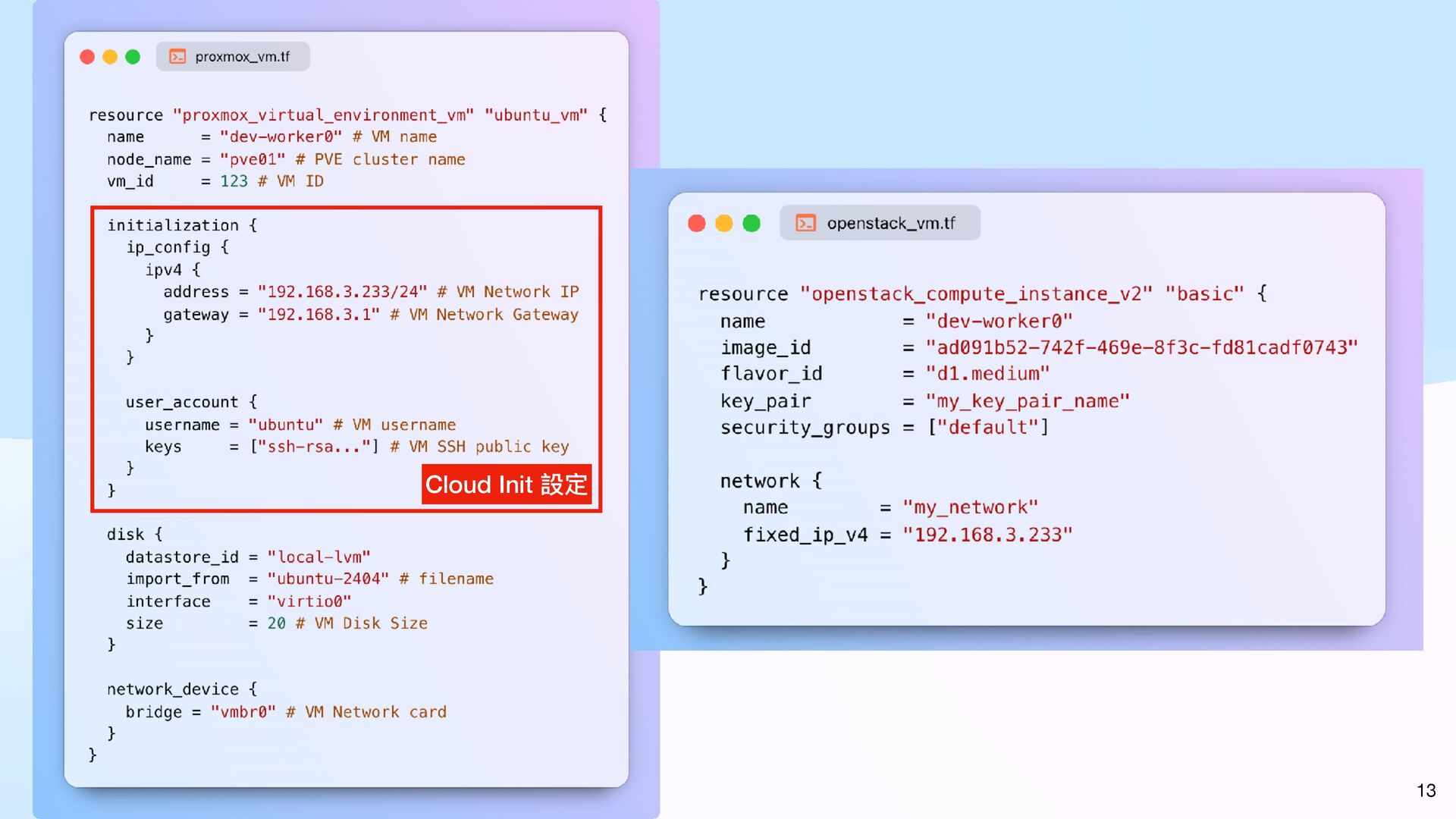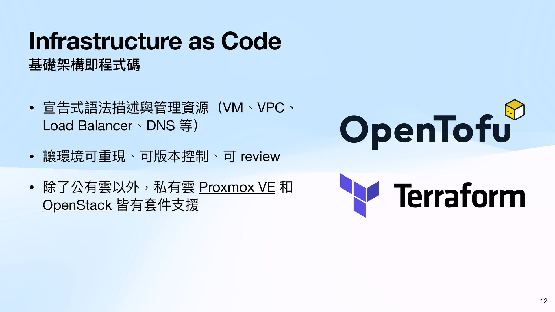 除了公有雲以外,私有雲 Proxmox VE 和 OpenStack 皆有套件 支 援 Infrastructure as Code 12