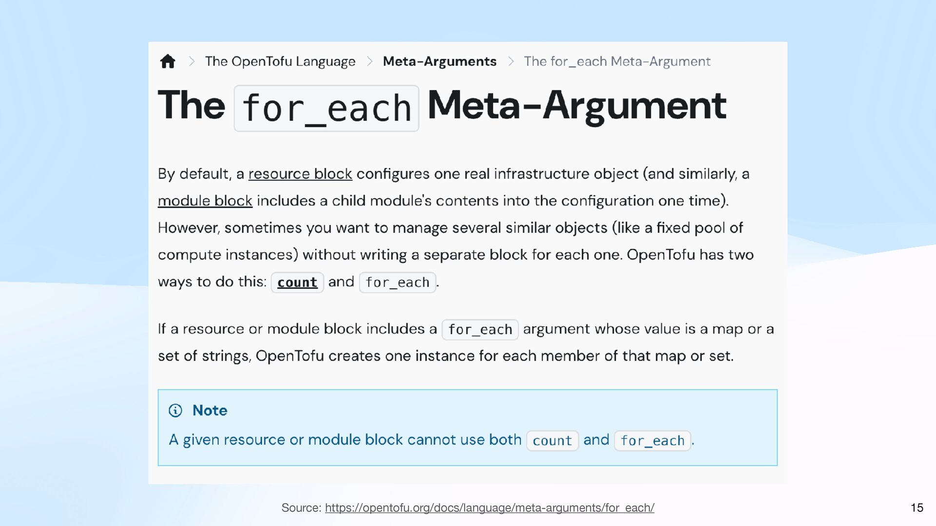 15 Source: https://opentofu.org/docs/language/meta-arguments/for_each/