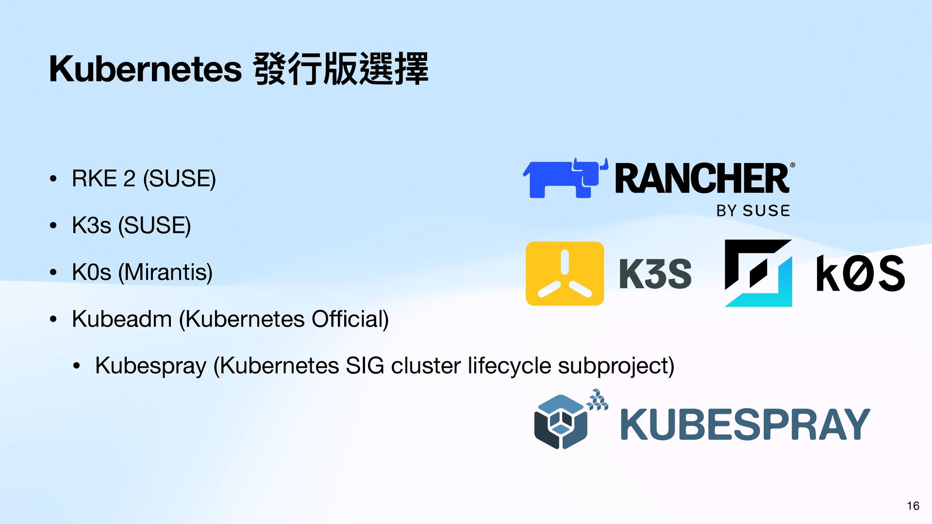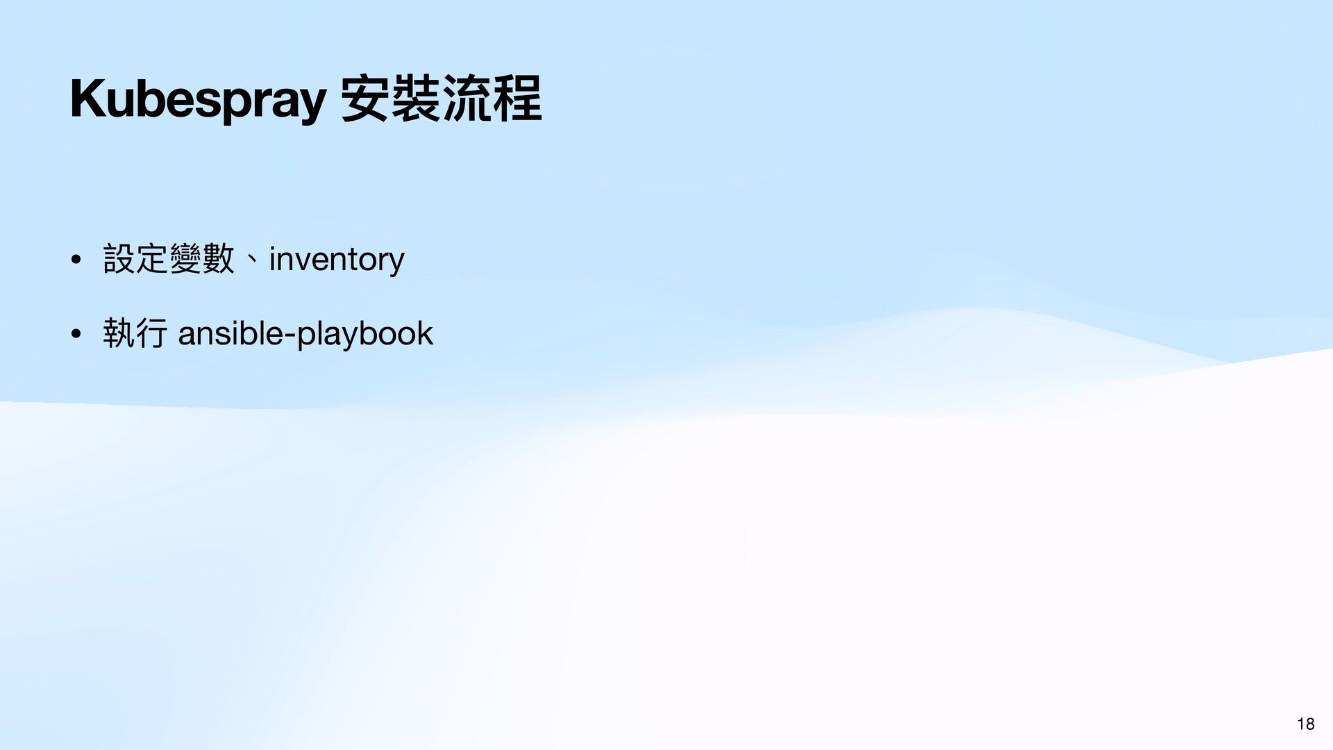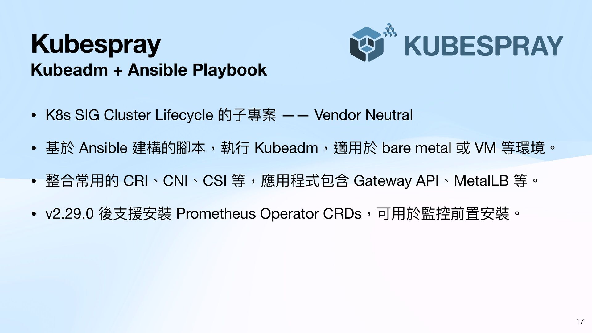 的 子 專案 —— Vendor Neutral • 基於 Ansible 建構的腳本,執 行 Kubeadm,適 用 於 bare metal 或 VM 等環境。 • 整合常 用 的 CRI、CNI、CSI 等,應 用 程式包含 Gateway API、MetalLB 等。 • v2.29.0 後 支 援安裝 Prometheus Operator CRDs,可 用 於監控前置安裝。 17