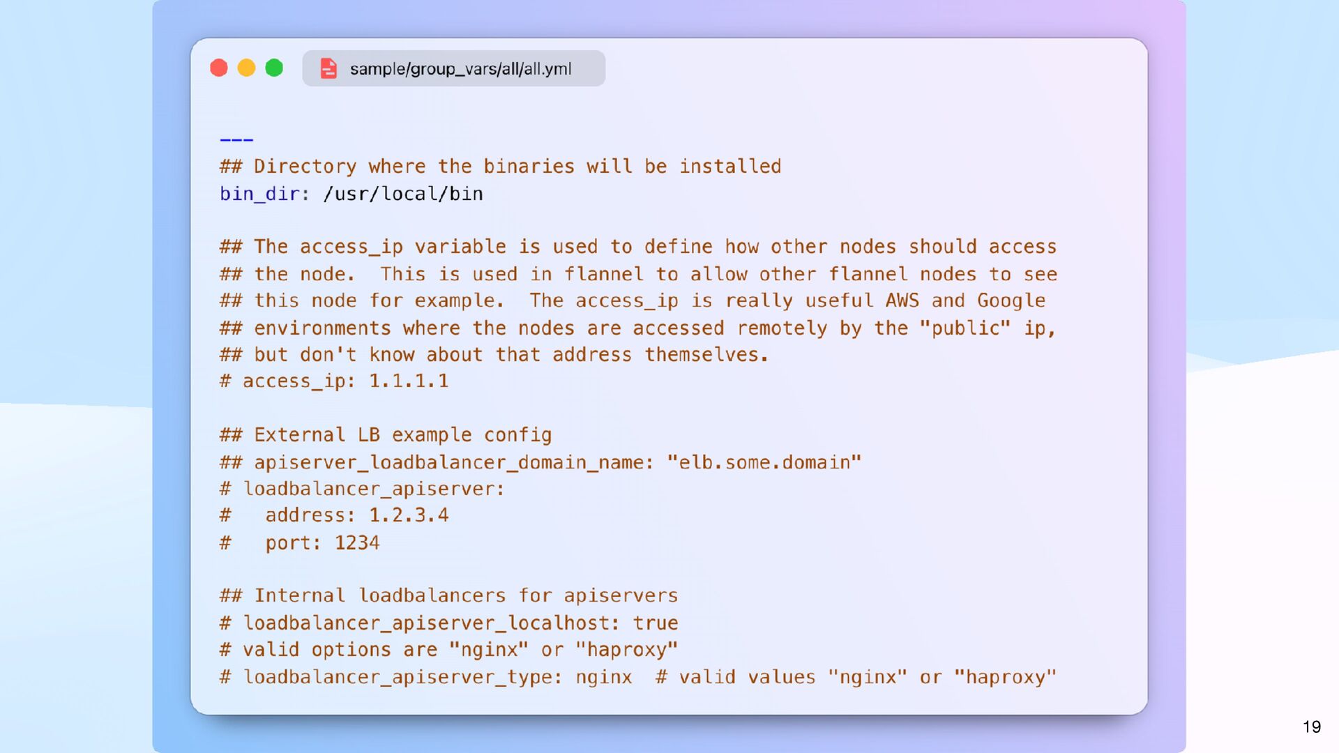 Kubespray 安裝流程 • 設定變數、inventory • 執 行 ansible-playbook 18