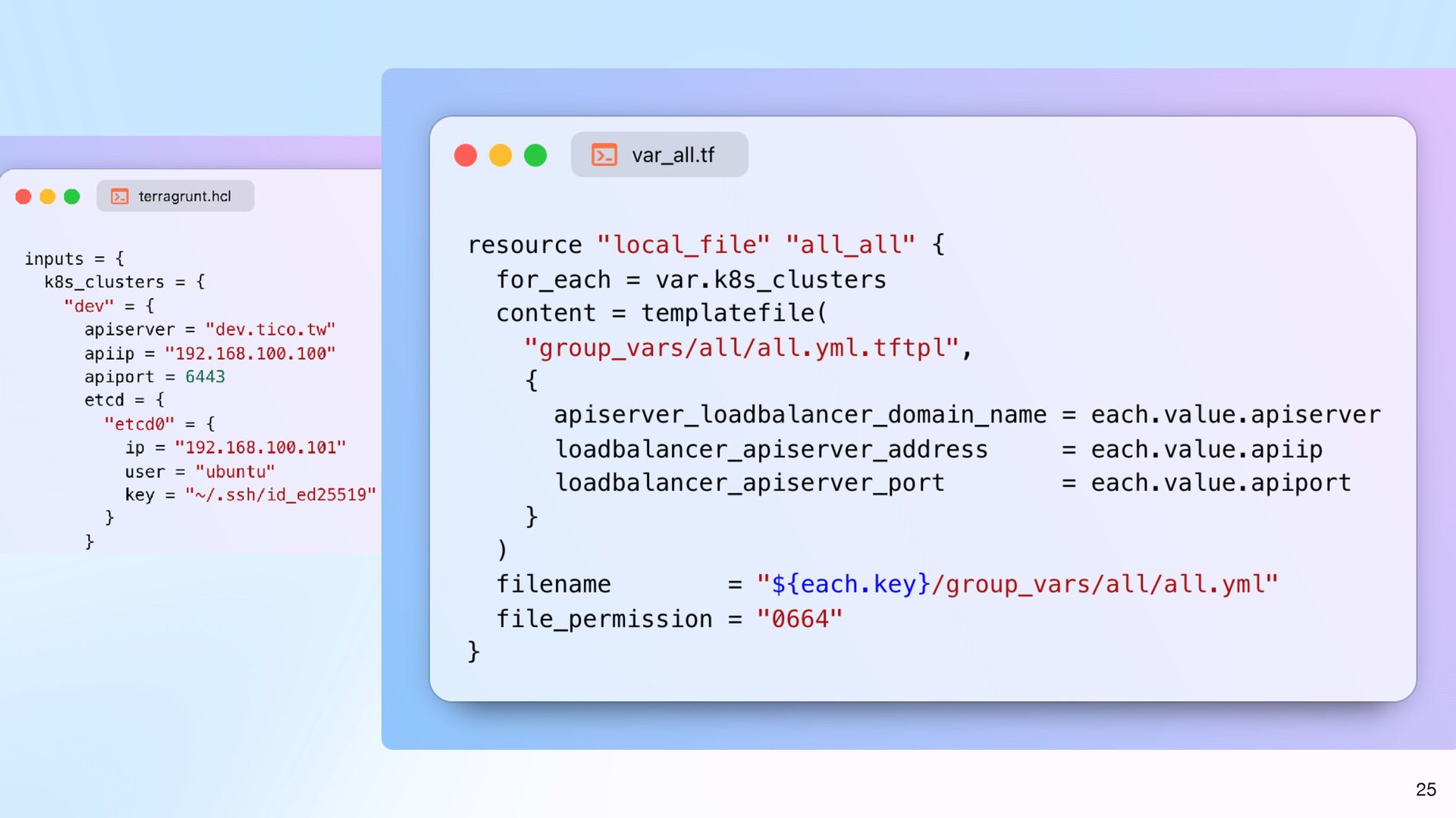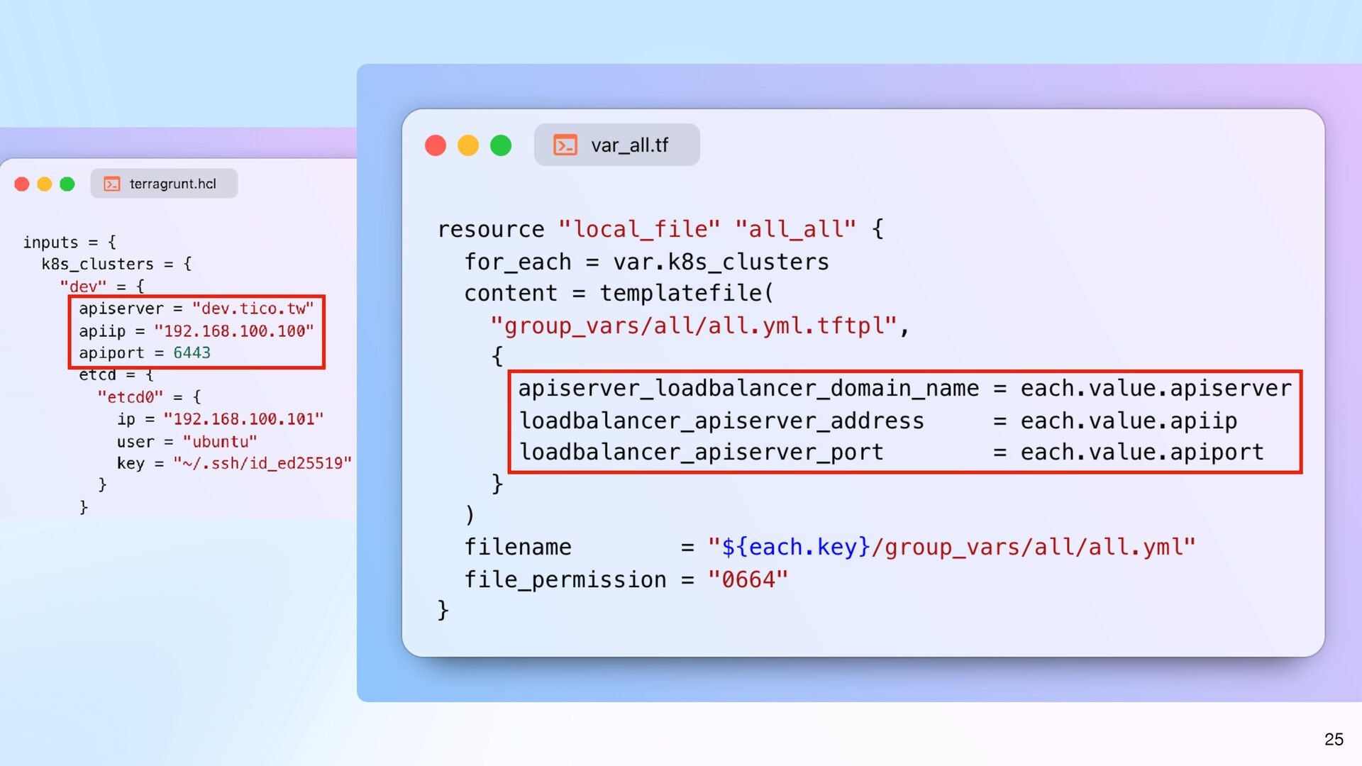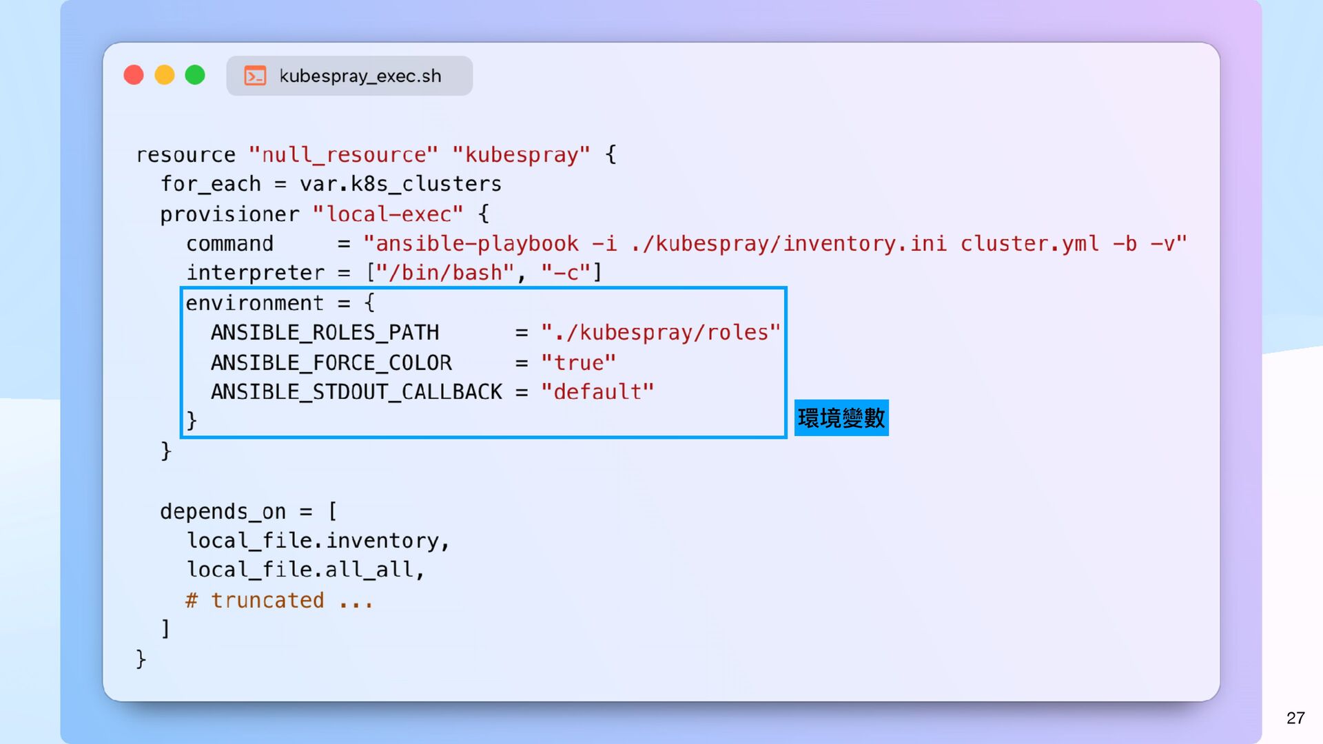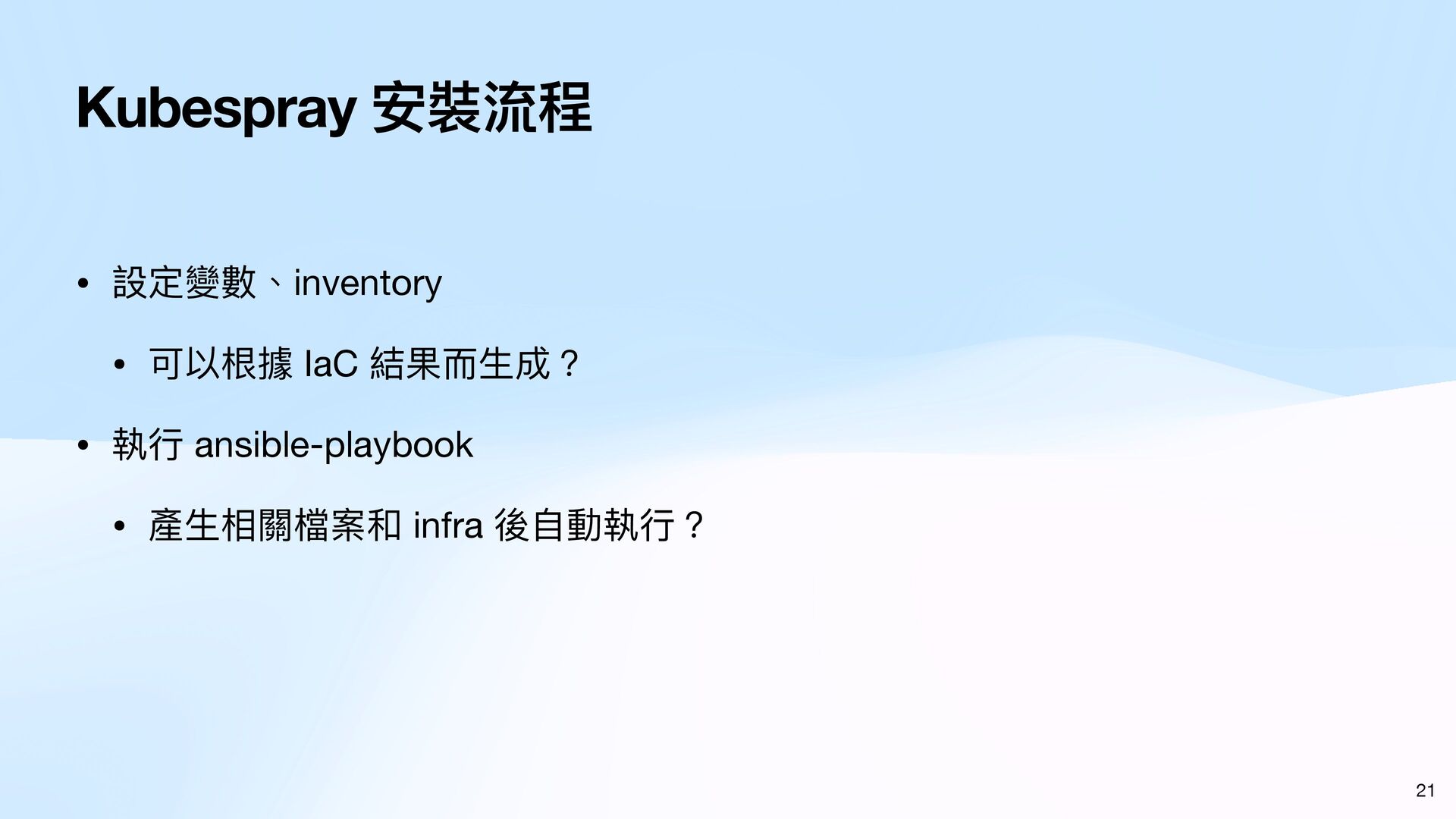 Kubespray 安裝流程 • 設定變數、inventory • 可以根據 IaC 結果 而生 成?