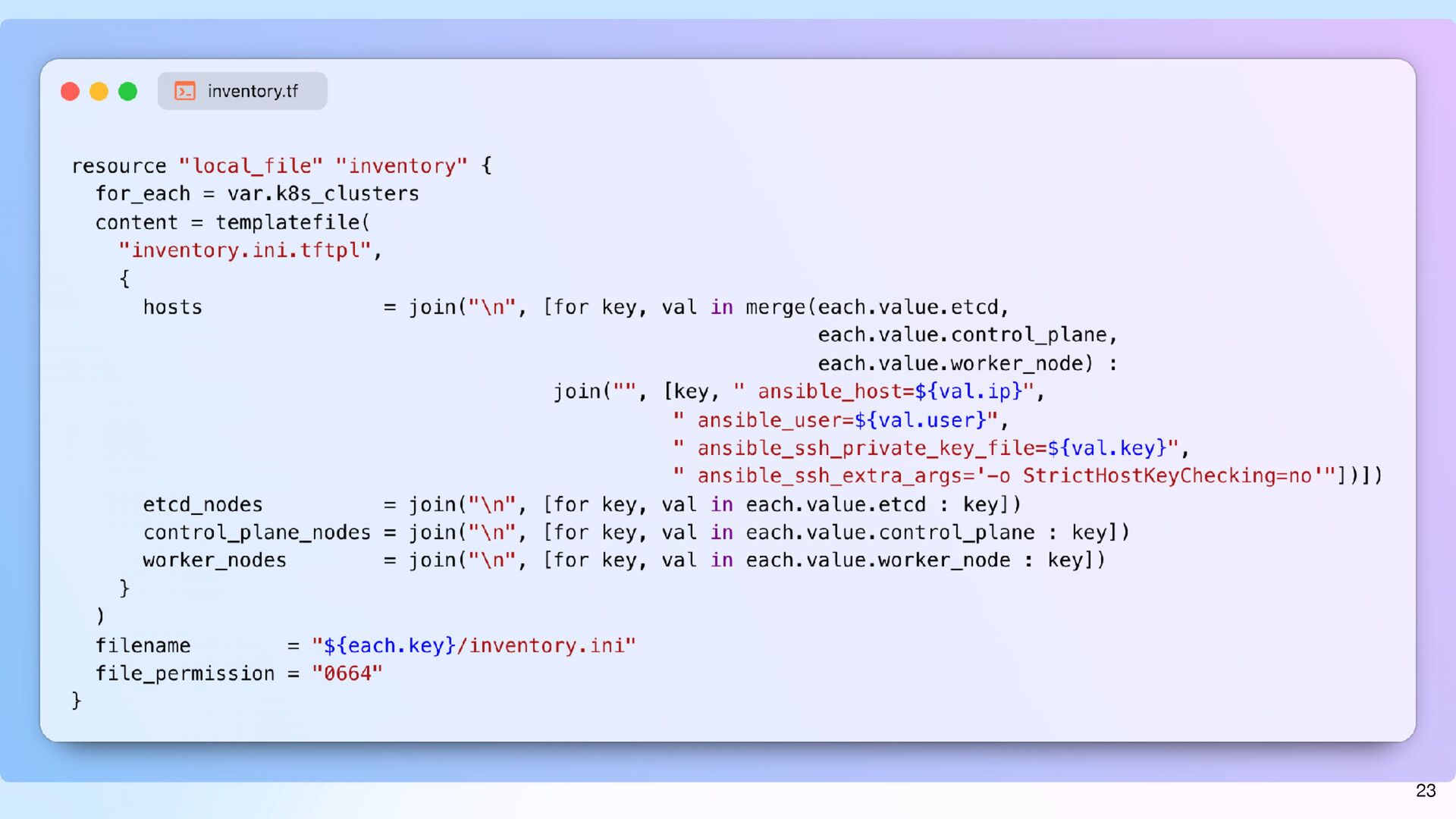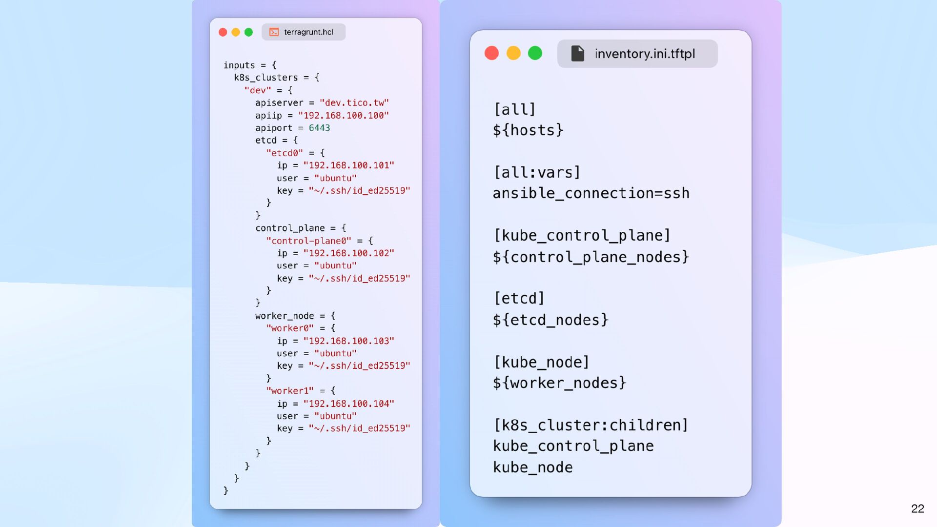 • 執 行 ansible-playbook • 產 生 相關檔案和 infra 後 自 動執 行 ? 21