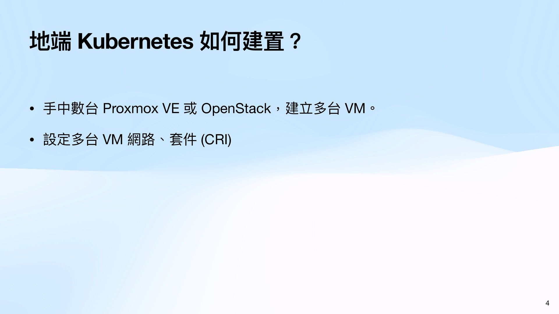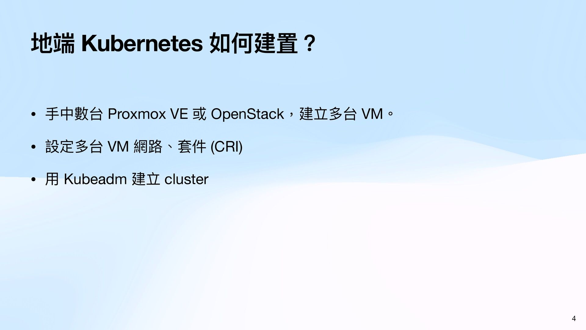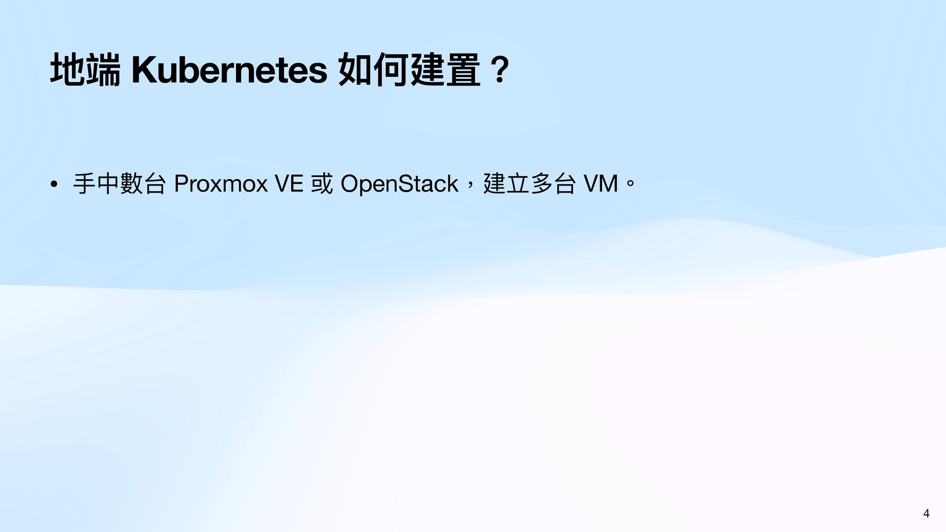 地端 Kubernetes 如何建置? • 手 中數台 Proxmox VE 或 OpenStack,建立多台