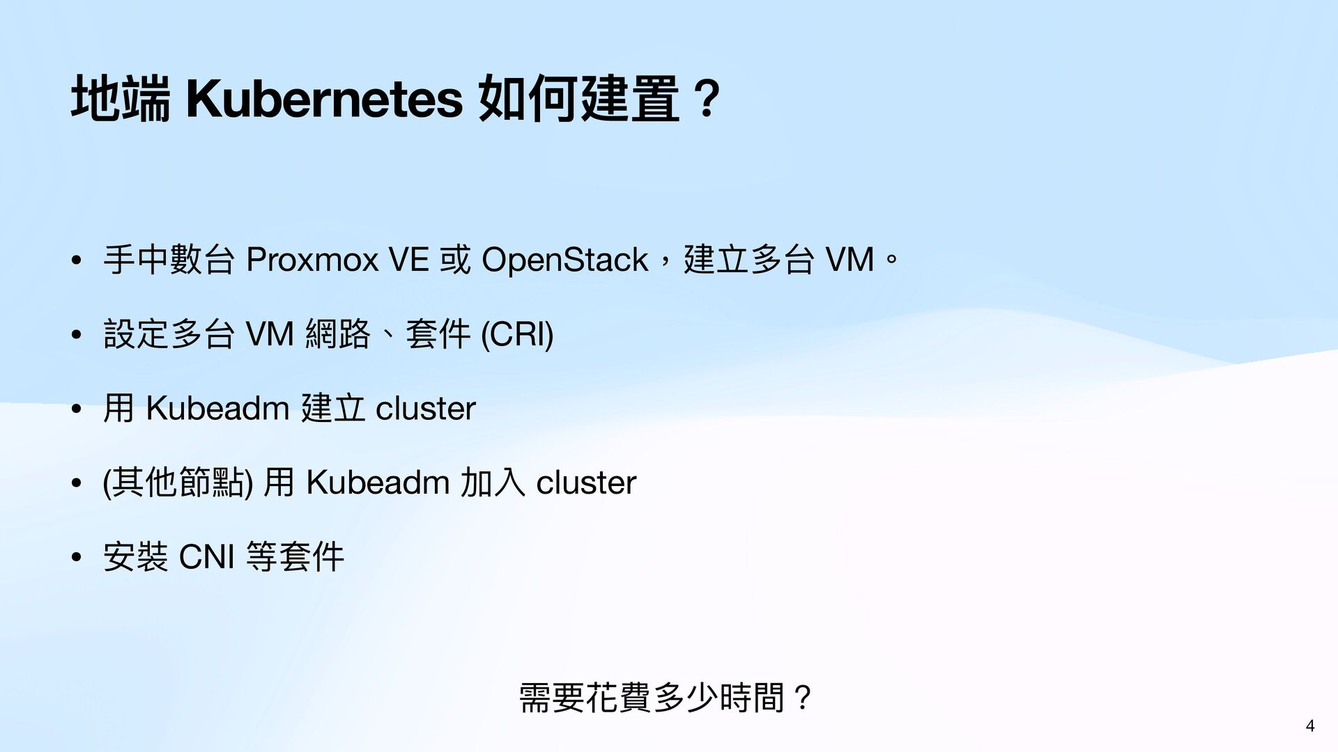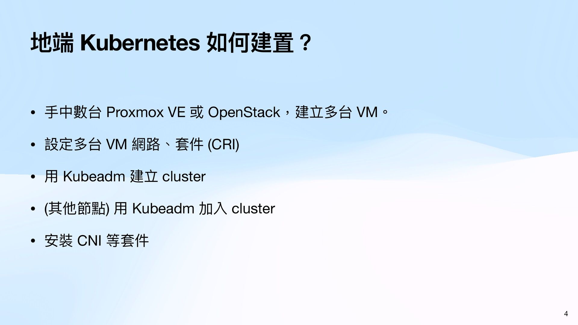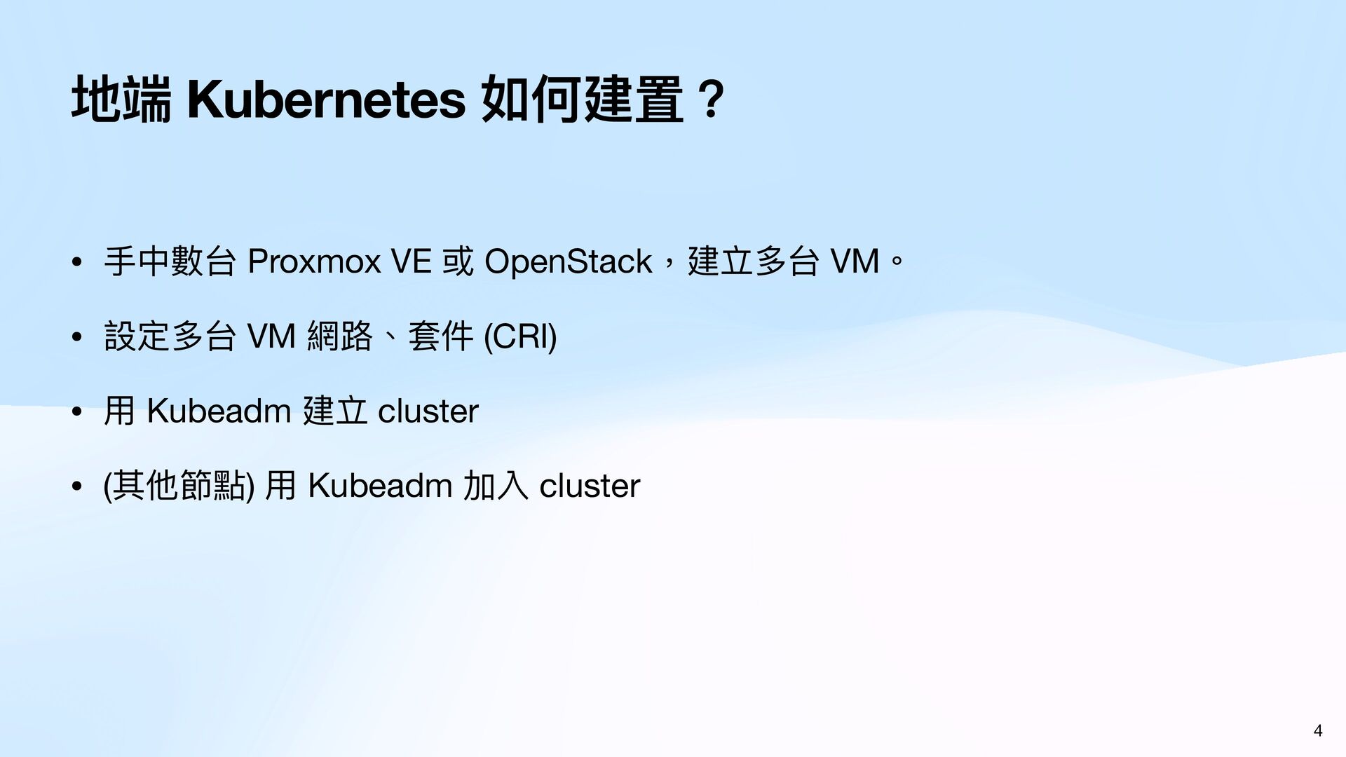 地端 Kubernetes 如何建置? • 手 中數台 Proxmox VE 或 OpenStack,建立多台