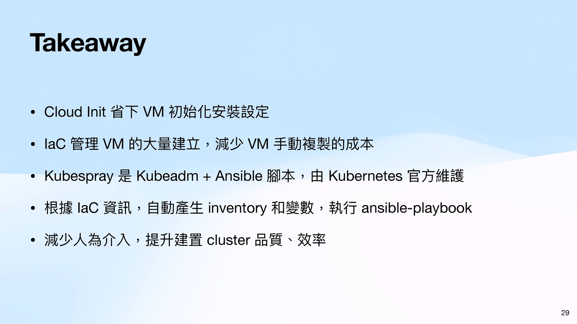Takeaway • Cloud Init 省下 VM 初始化安裝設定 • IaC 管理