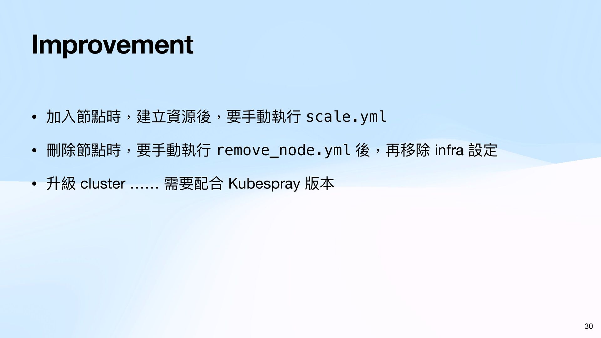 動執 行 remove_node.yml 後,再移除 infra 設定 • 升級 cluster …… 需要配合 Kubespray 版本 30