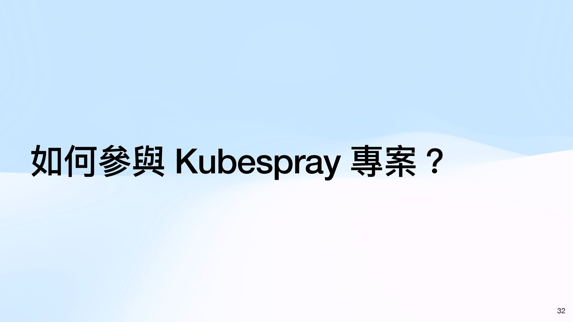 如何參與 Kubespray 專案? • 專案網站:https://kubespray.io • 加入 Kubernetes Slack 頻道: