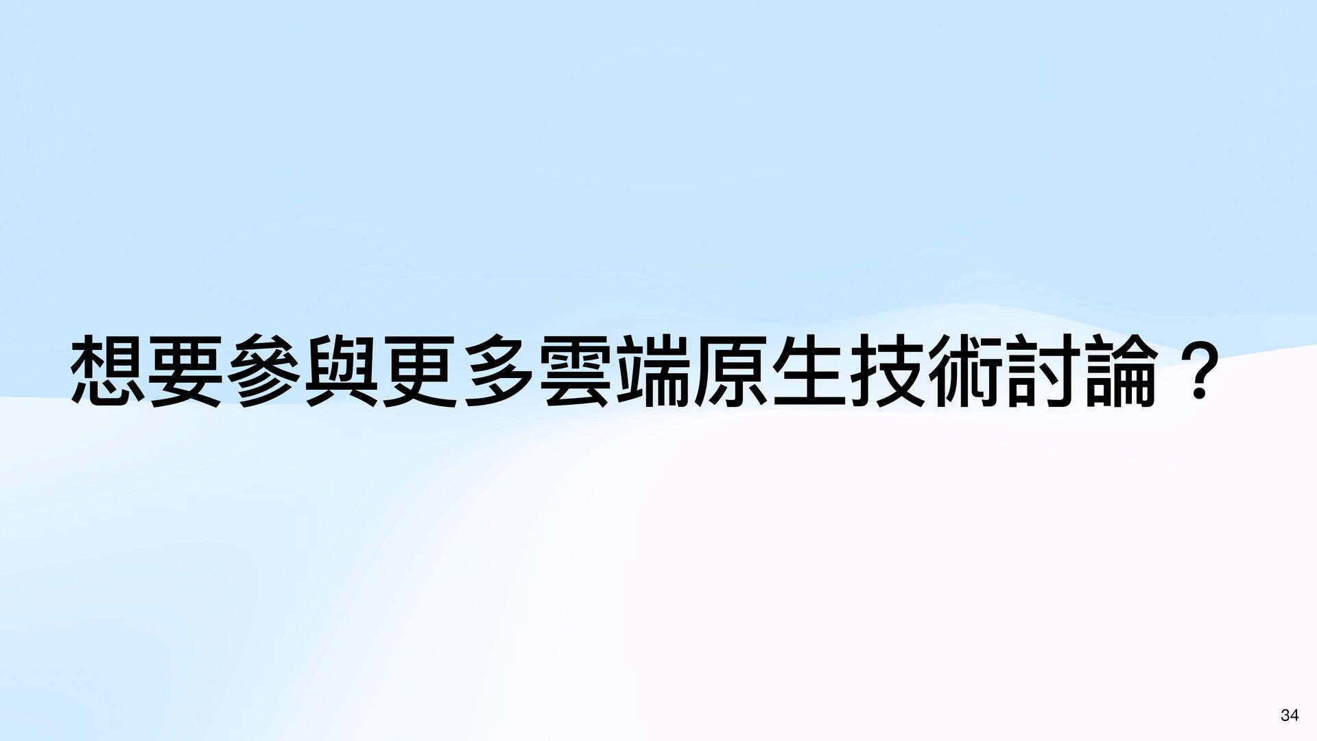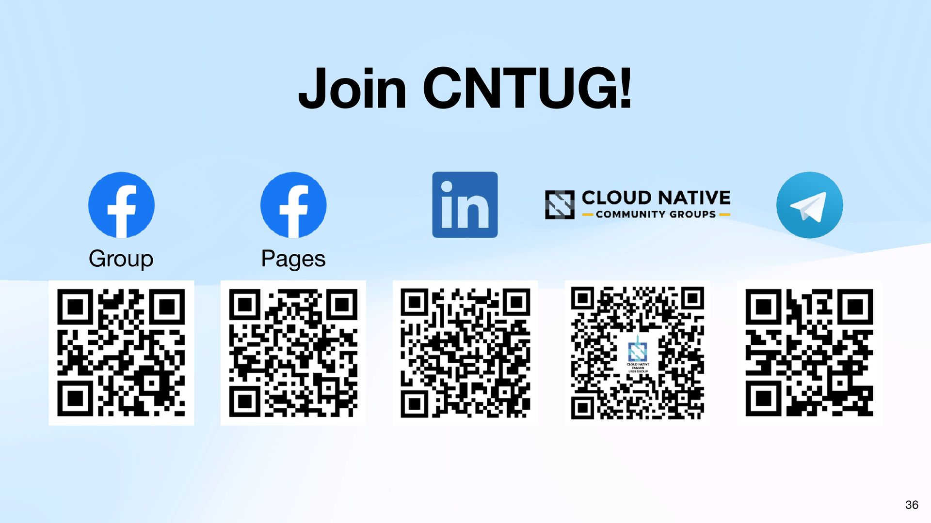 • 活動皆免費*限額報名參與。 • 投稿後並完成演講,我們將會贈 送 CNCF Store 一 件禮物! • 官 方 網站:https://cloudnative.tw CNTUG meetup 每 月 聚會 + Call for Speaker 徵稿連結 CNTUG 聚會報名 官 方 網站 * 僅收場地費